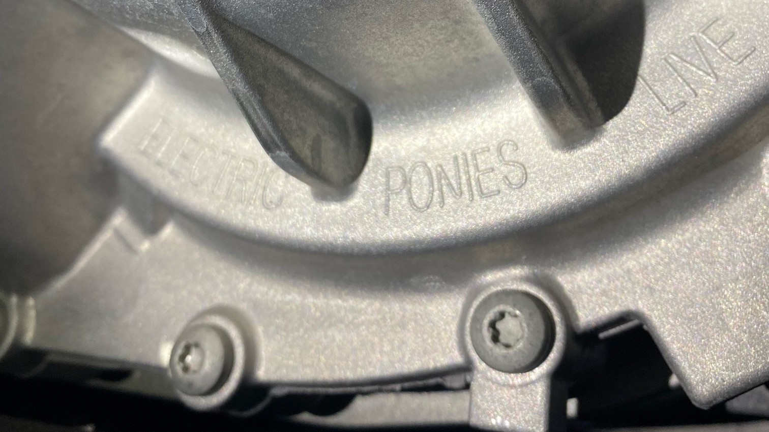 The photos show a line of text printed into the metal casing of the Mach-E electric motor reading "Electric Ponies Live Here," as a nod to this street-cruising all-electric crossover's tenuous branding connection with the iconic Mustang sports car.