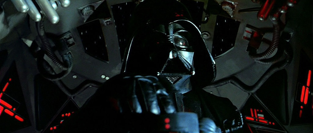We also get a good look at the main flight controls of the TIE, which appear to be these two big handles. If we go back to 1977's original Star Wars, we can see that Darth Vader's TIE Advanced fighter used essentially the same control scheme: