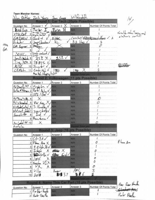 Anyway, now let's get to the questions. There were five rounds of 10-ish questions. The topics were: Car Tech (I wrote these), Volkswagen (Jason wrote these), Jeep (I wrote these), Know This Part/Tool (Jason and I both wrote these), Taillight Madness (of course, these were Jason's questions). Let's start with the tech section: