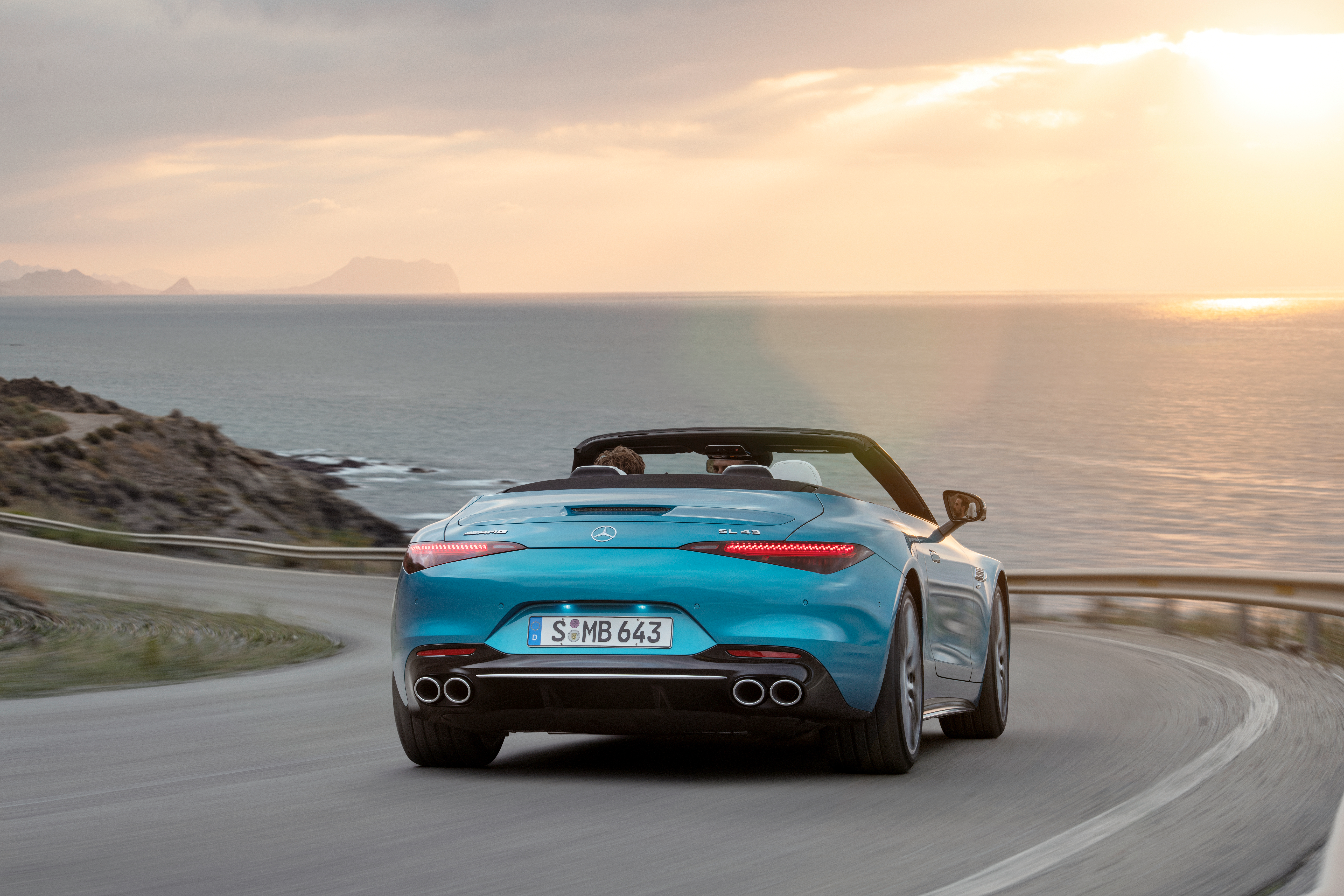 This SL is all new for the first time in a long time, and it looks fantastic! Gone is the folding metal roof of more recent generations. In its place is a much simpler soft top. The trunk still has plenty of room for golf clubs, don't worry.