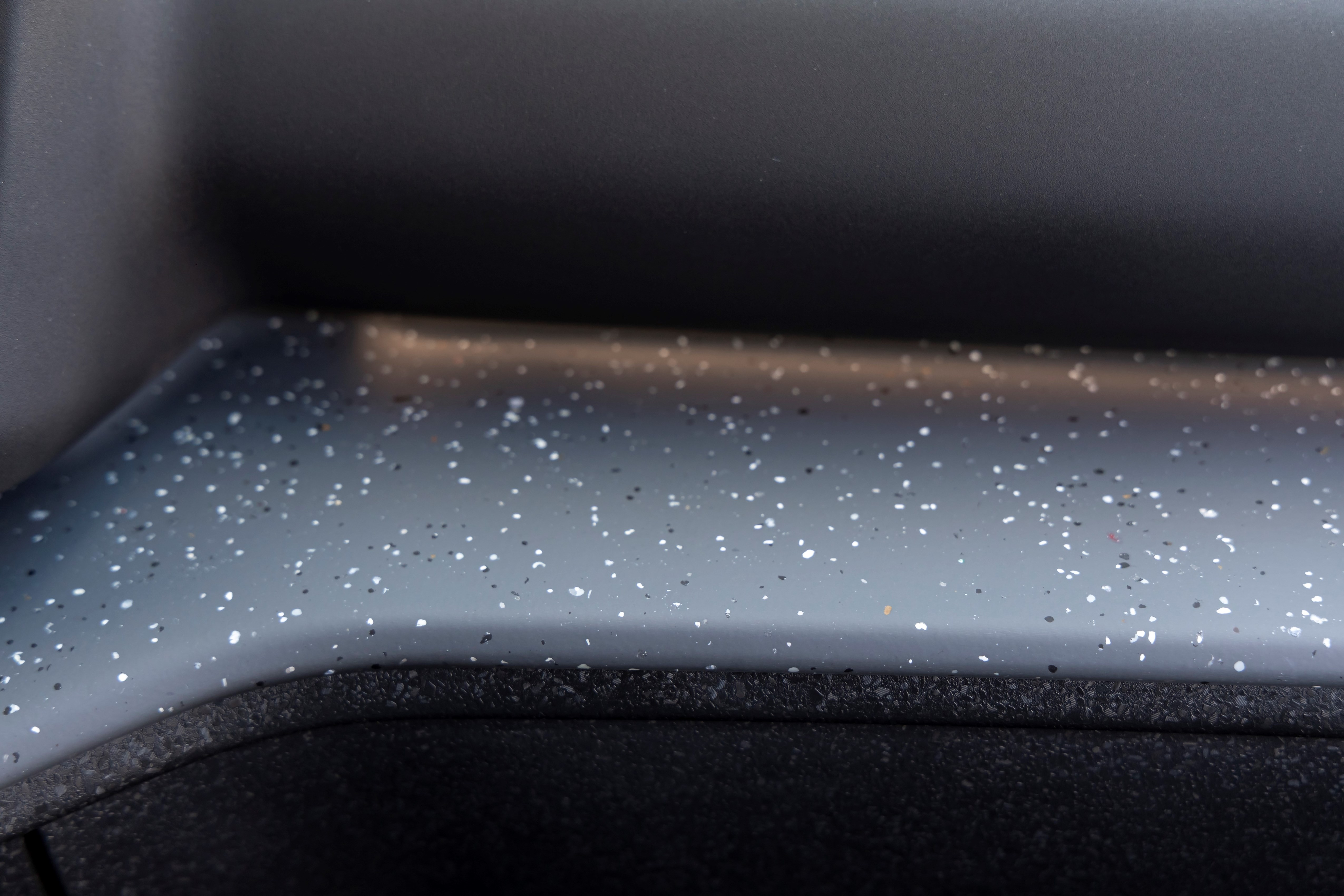 My clear favorite part of the interiors, the little pieces in the Particle plastic are made up of UV resistant recycled windows and roller shades. Such plastics are usually not recycled.