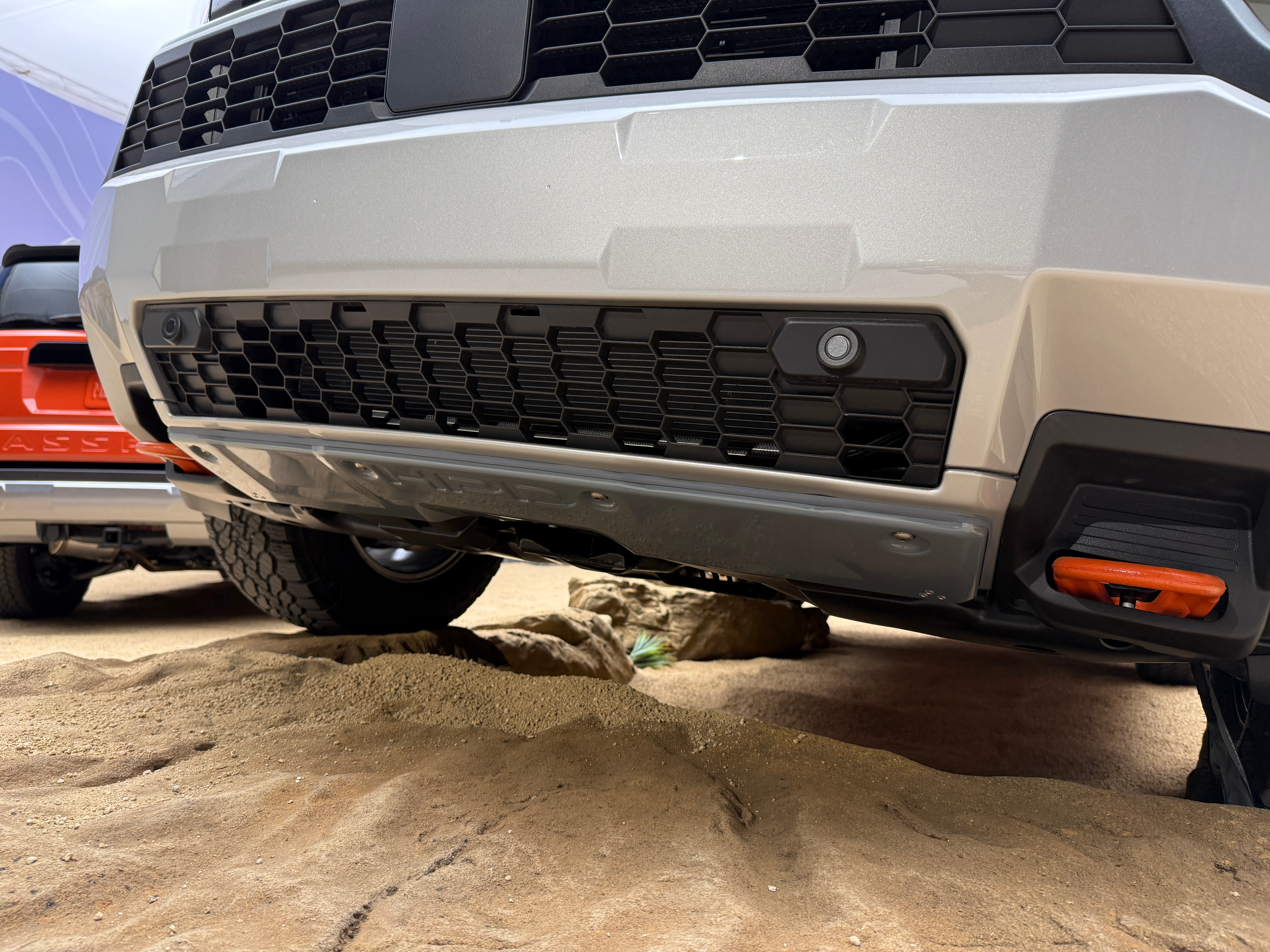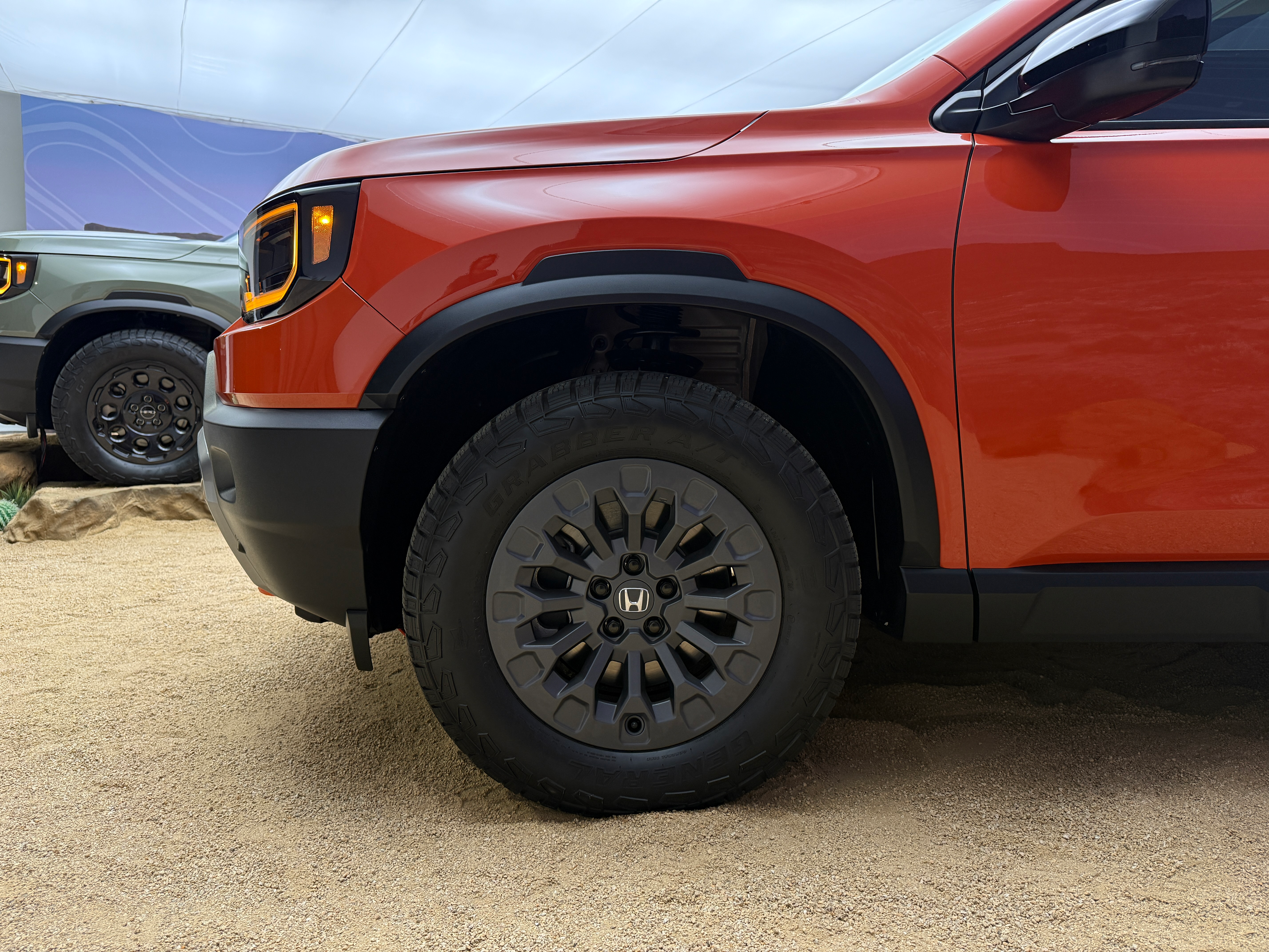In addition to the standard underbody skid plates made from thick steel that protect the gas tank, oil pan and transmission, Honda will offer further accessories like additional skid plate elements and rock rails. Also, the wheel valve stems are sunken so you don't knock them off when off-roading, and the exhaust is tucked underneath the rear bumper so you don't knock that off either.