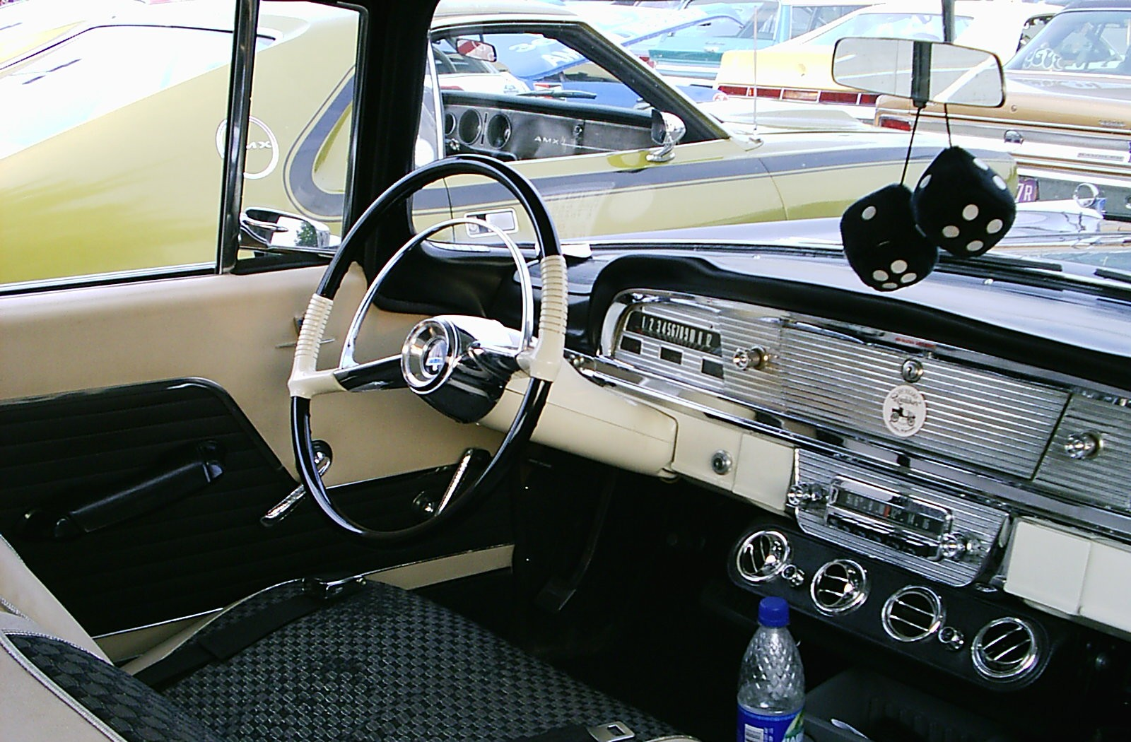 Fuzzy dice in the mirror. Can't drive a car without fuzzy dice.