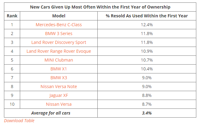 As you can see the list is filled with mostly German and British cars with the Nissan Versa sneaking into the top ten. The most likely explanation for the luxury cars is that many of these models are used as dealer demos, then "sold" and moved into the used/Certified Pre-Owned fleet, which means you'll find a large volume of barely used C-class, 3 Series, and small-to-midsize luxury crossovers on the used market.