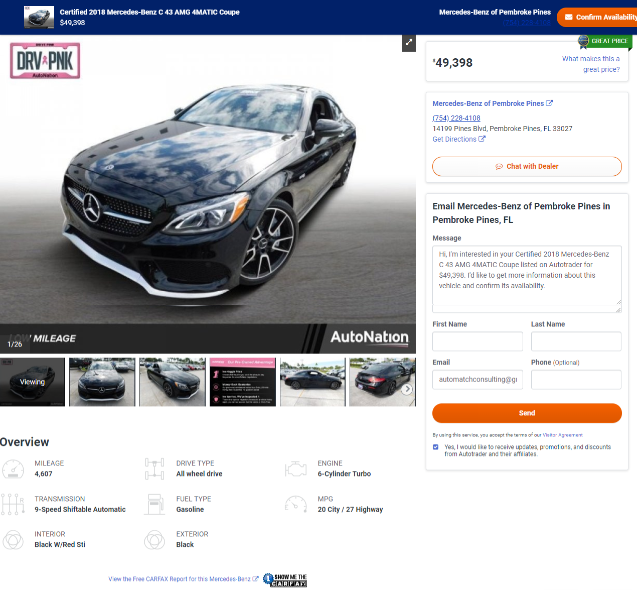 In the number one spot is the Mercedes C class, but maybe you're looking for a sporty coupe instead of a sedan. A C43 AMG has a starting MSRP of around $60,000, with well-optioned cars pushing into the mid $60,000 range. Here is a Certified Pre-Owned example with fewer than 5000 miles for just under fifty grand: