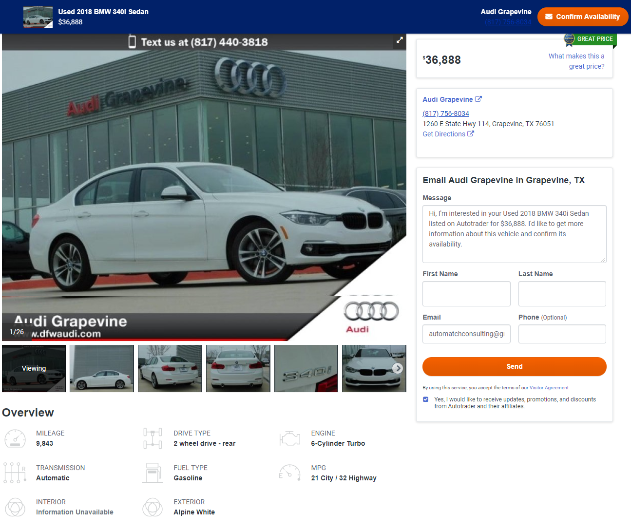 The BMW 3 series has been the benchmark for luxury sport sedans for a while, and even though an all-new model just arrived, the previous generation can still be a pretty good drivers' car, though going for the turbocharged six-cylinder 340i can be a pricey option given the almost $50,000 starting price. But when depreciation is your friend. you can land something like this with less than 10,000 miles for almost the same price as a loaded Mazda6.