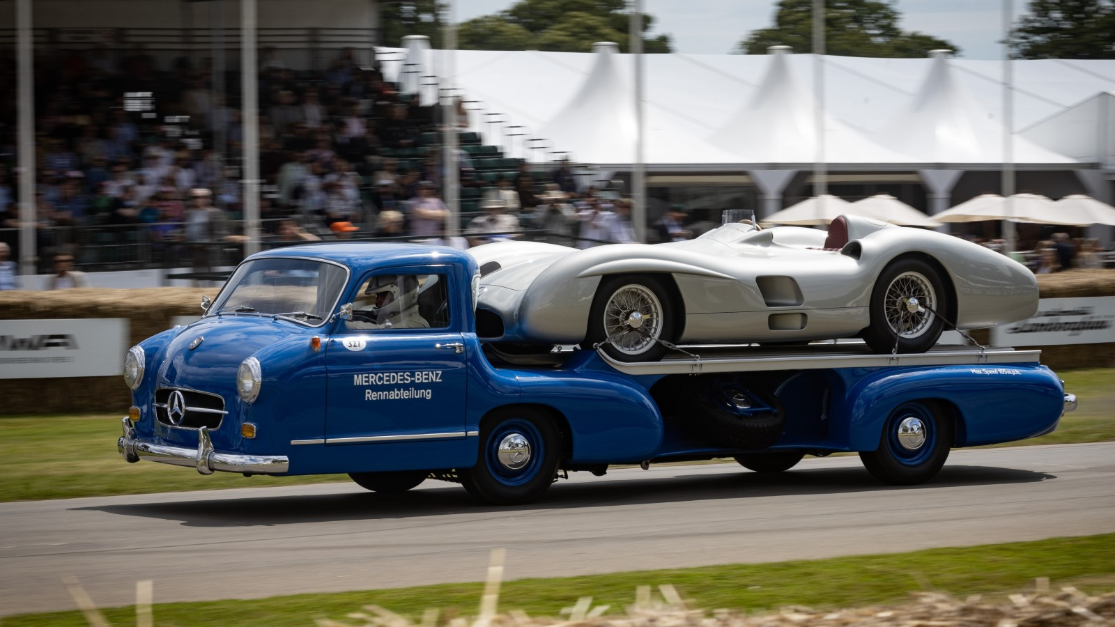 This is slick, really slick. Called Blue Wonder, the Mercedes low-loader was on display in the Goodwood paddock before taking to the hill over the weekend, where it ran the course with a pristine W 196 R perched on the bed. Stunning scenes.