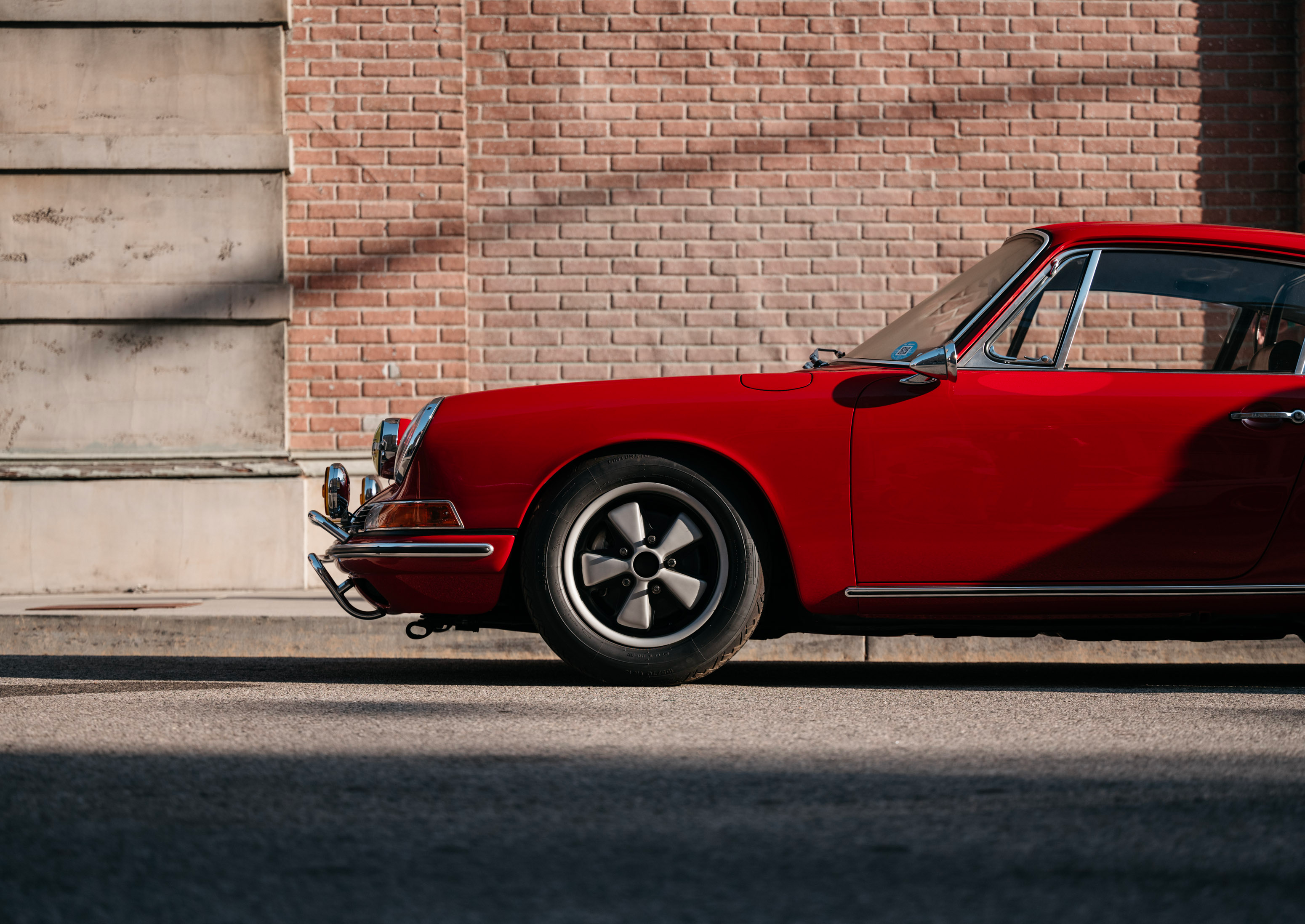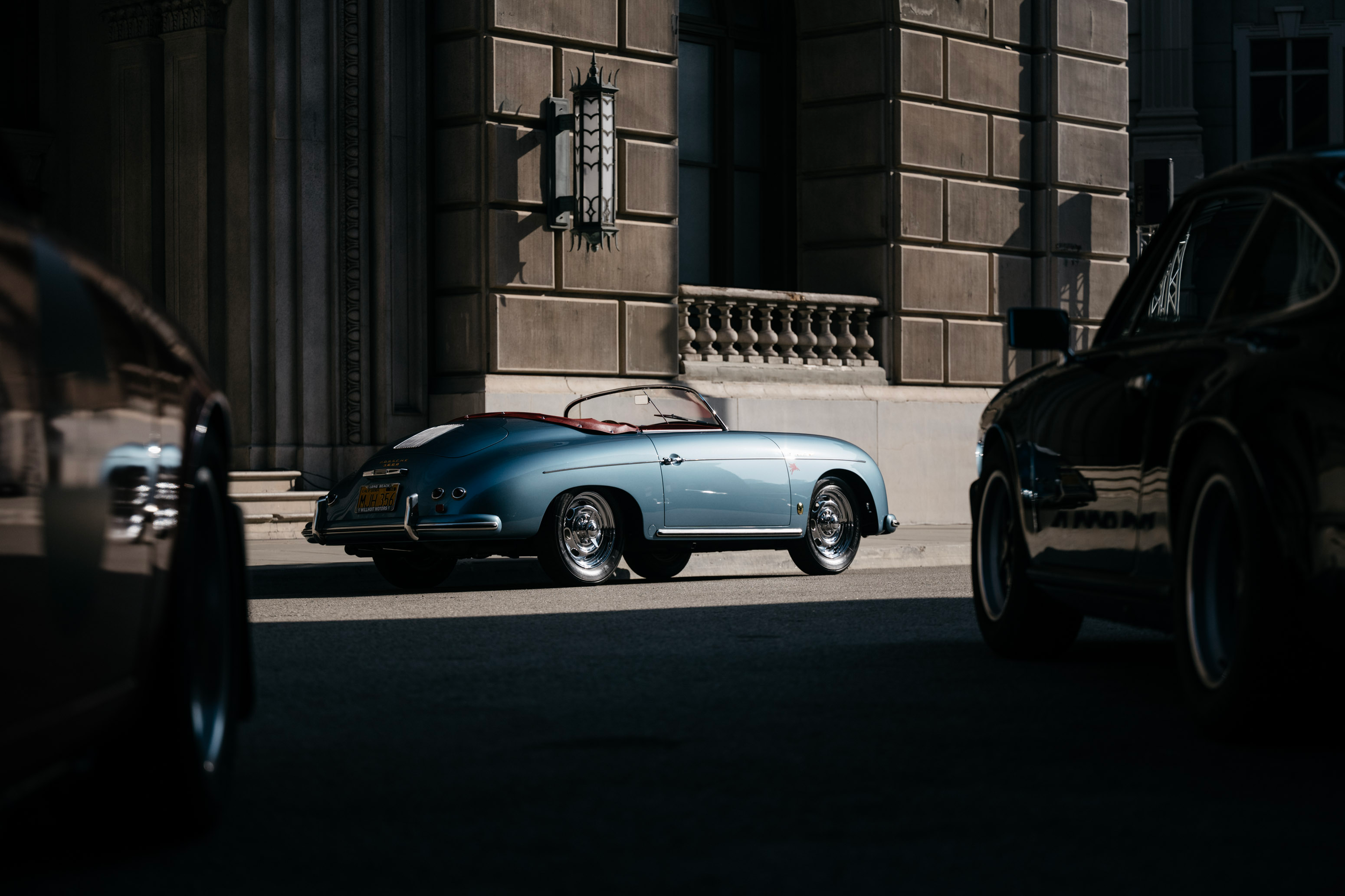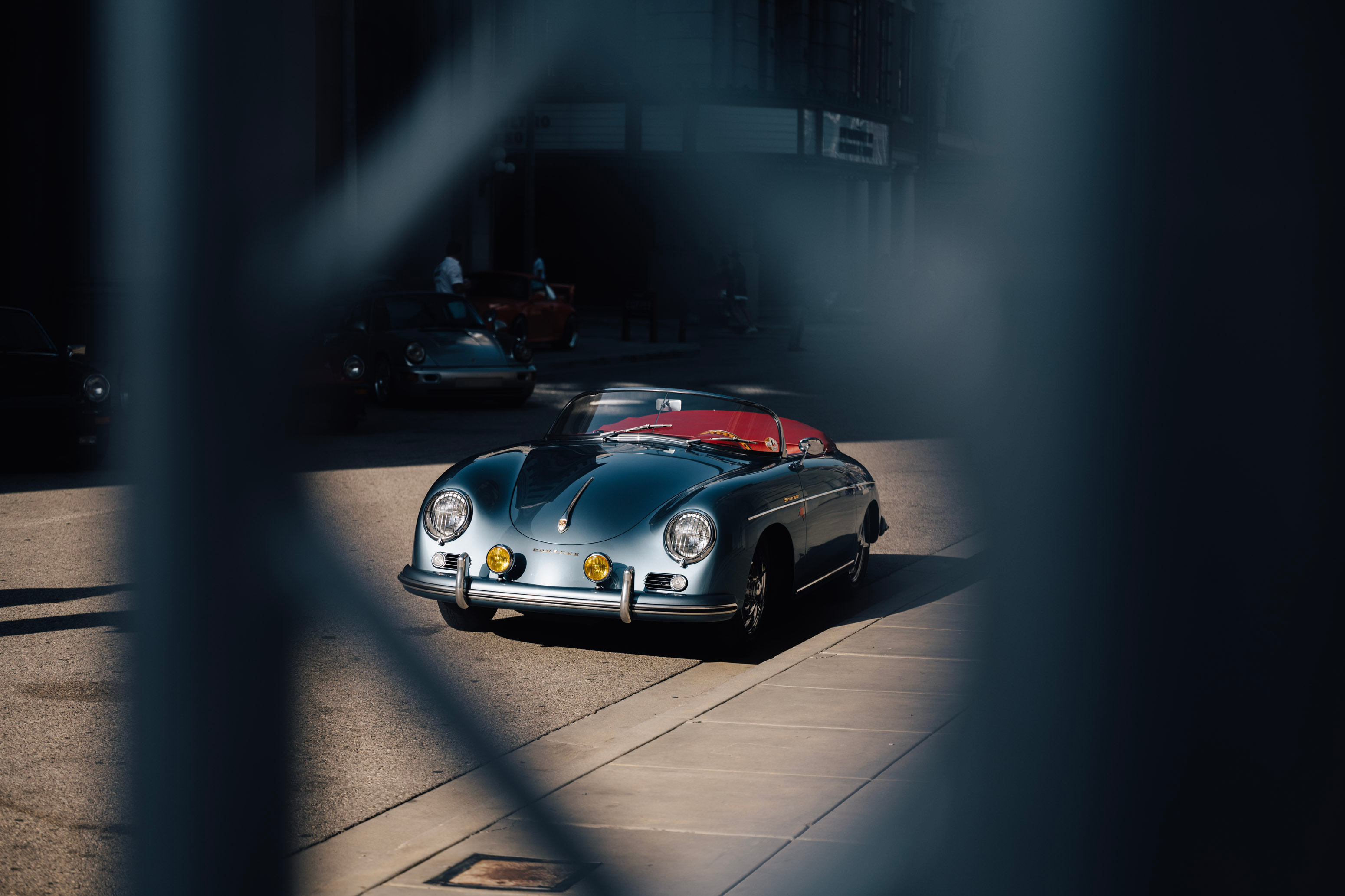 A 1967 356 Speedster with the original hardtop. Behind it on the left, a facade painted to look like a city block.