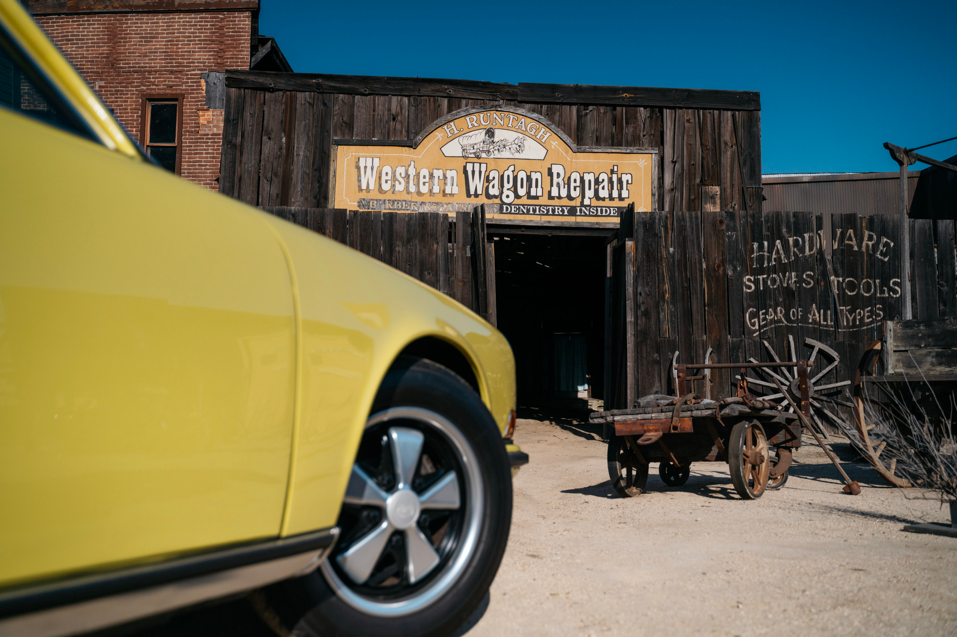 A Porsche from a porch. This Tangerine soft window 911 Targa in the Wild West area of the Universal backlot.