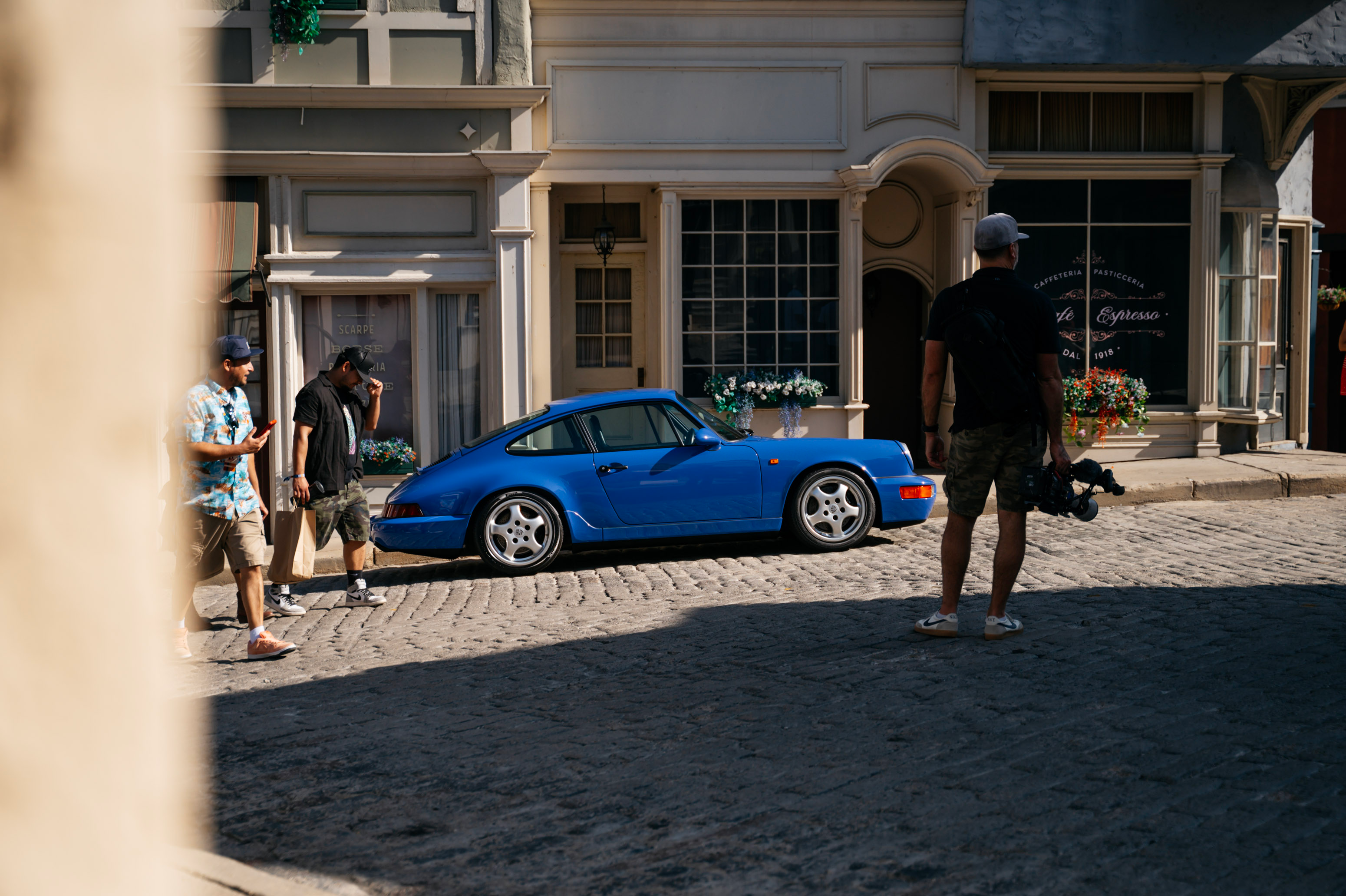 A Maritime Blue 1992 911 Carrera RS looks right at home in front of the fake Café Espresso.