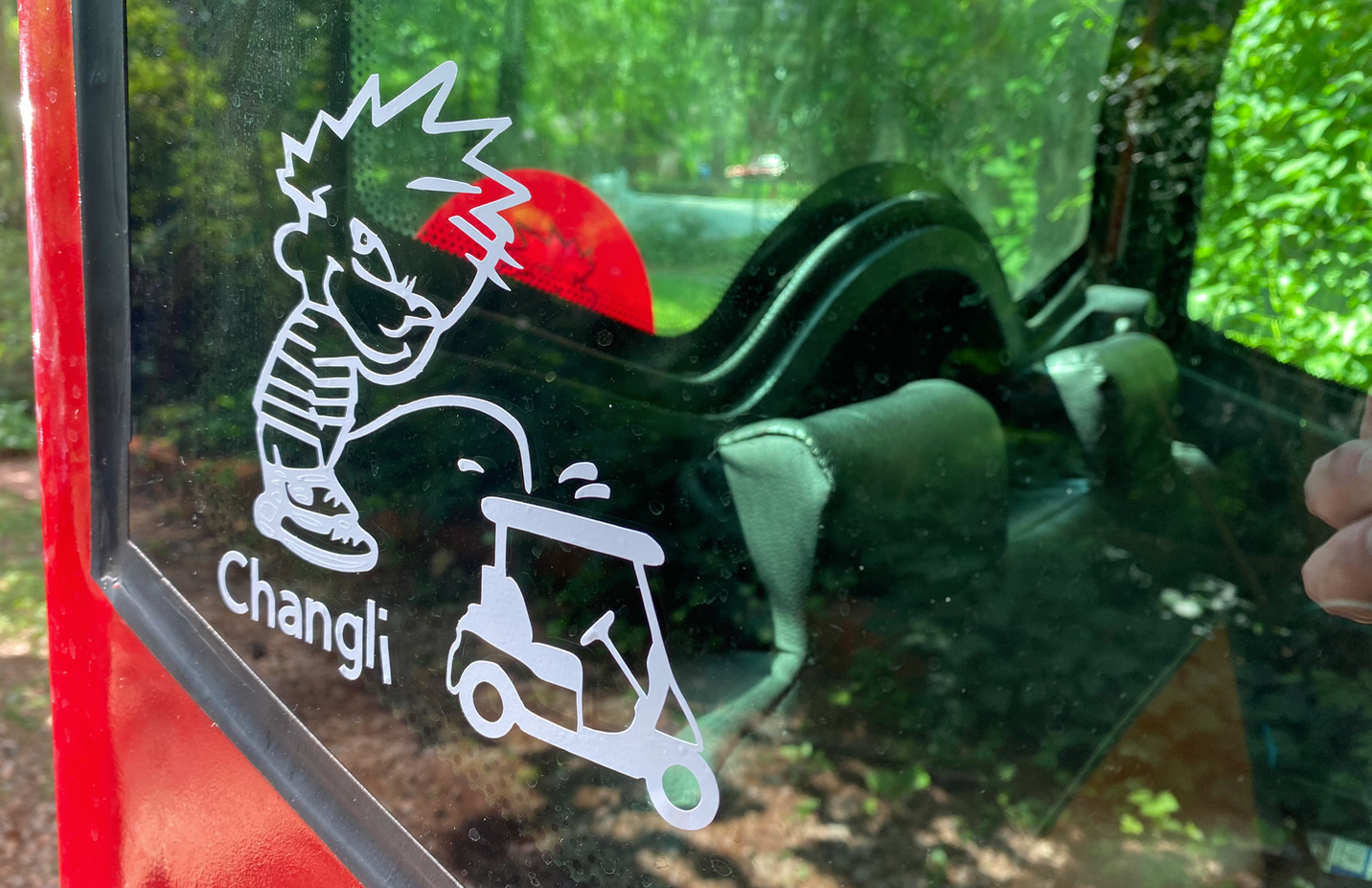 On the opposite side window, I feel like I need to make abundantly clear how much of a better deal a Changli is than some absurdly overpriced golf cart with no roof or windows or backup camera or heater or back seat or any of the many, many incredible wonders the Changli offers. And golf carts start at nearly eight grand. That's some serious bullshit, and I need something on my Changli to convey this complex concept.