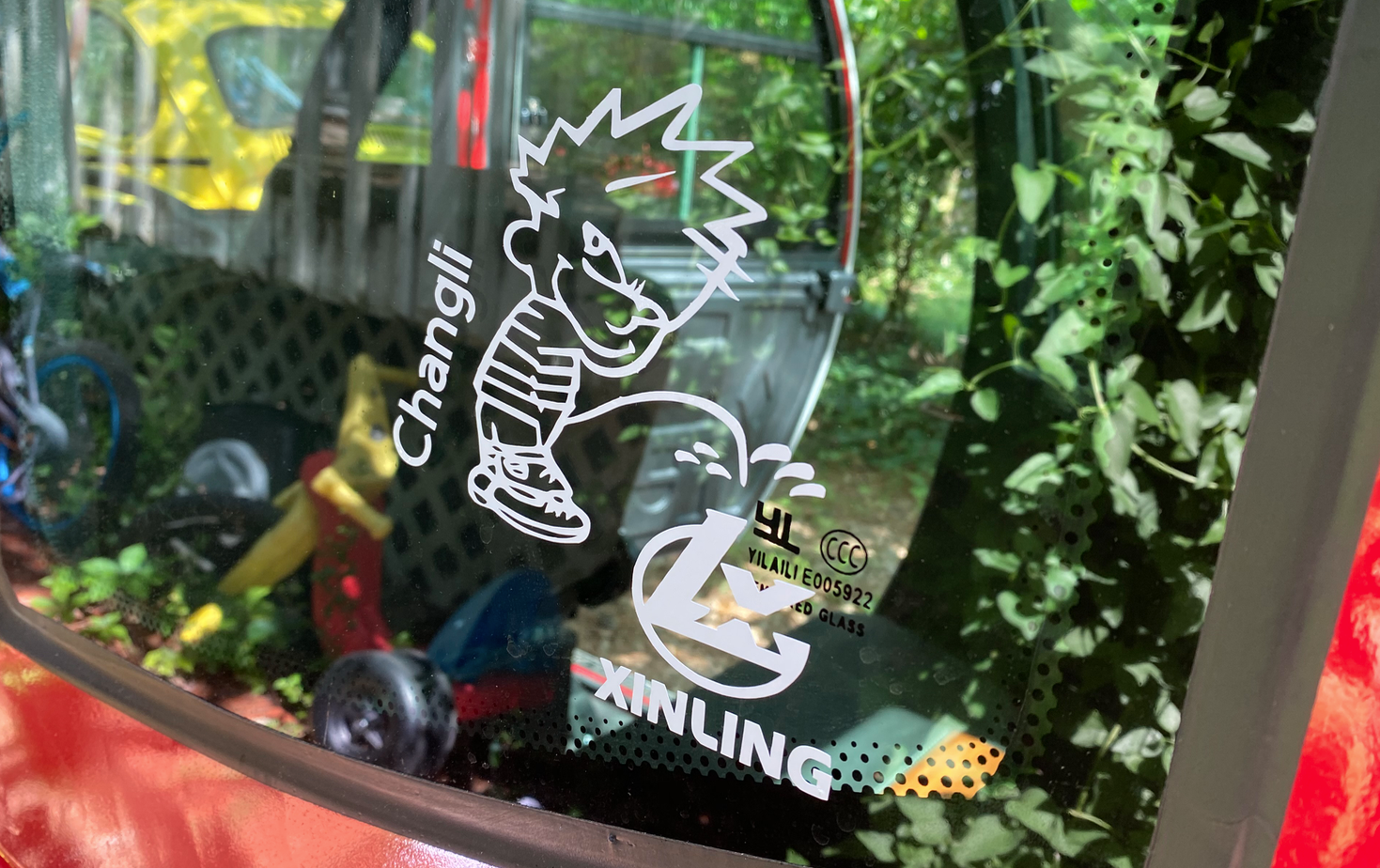 I have three Calvin-peeing stickers on the Changli, each highlighting a key element of Changli pride of ownership. First, we have the original request, Calvin peeing on the Xinling logo. I sort of randomly decided that, among the innumerable makers of these Chinese low-speed electric vehicles, Xinling was Changli's biggest rival, the Chevy to Changli's Ford, or vice-versa, depending on whichever one you'd rather push than drive.