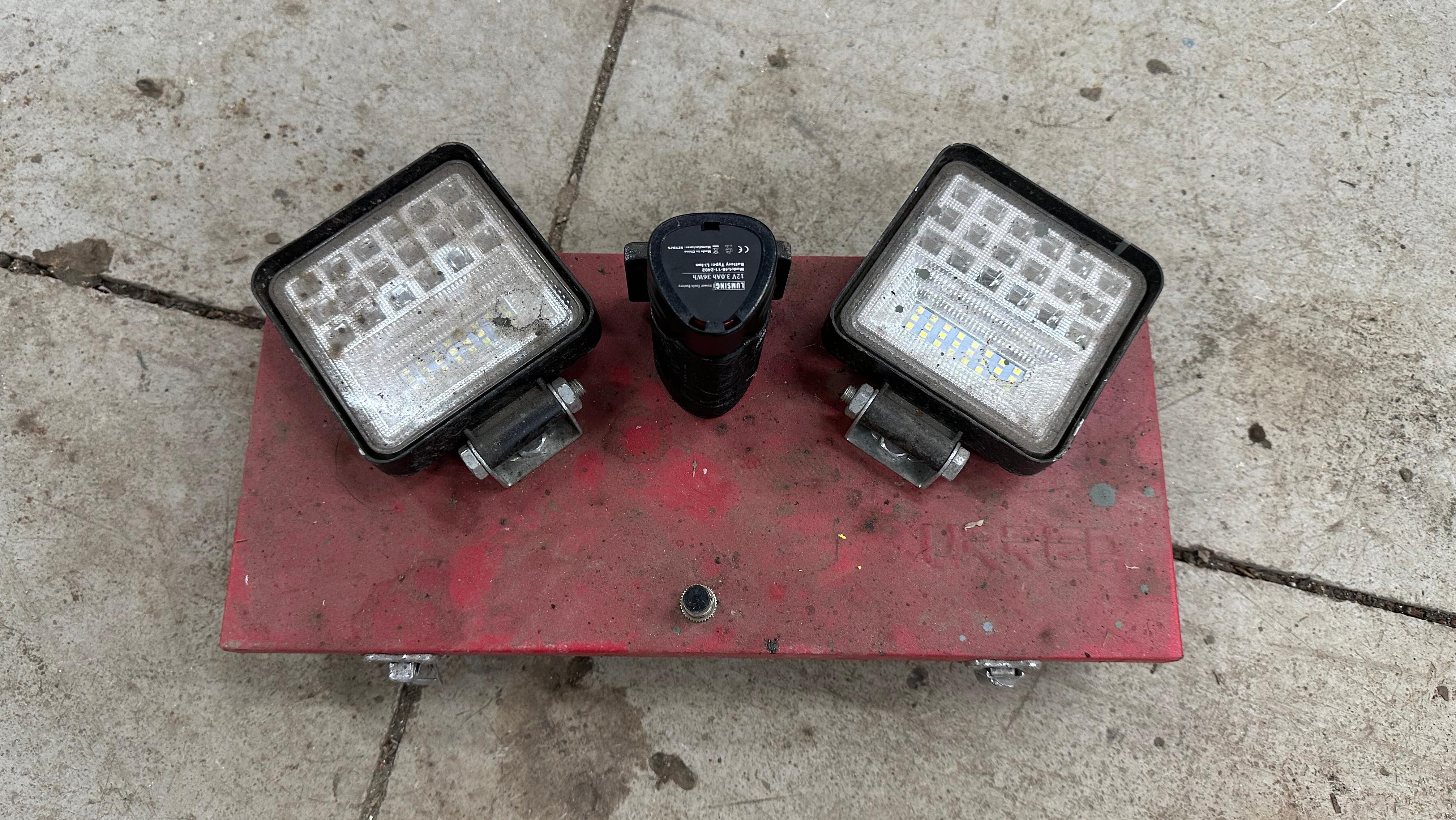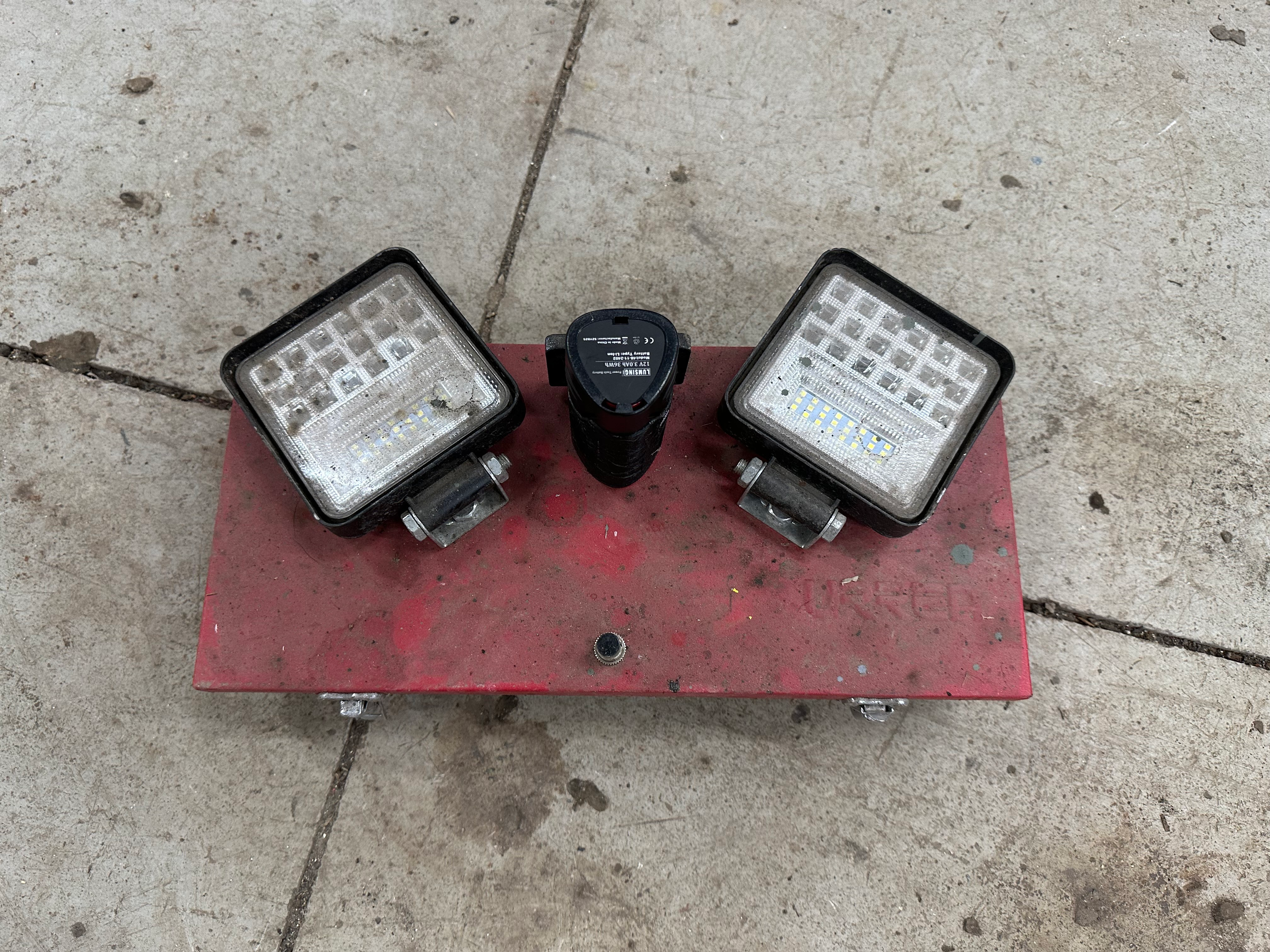 One thing Streamlight doesn't offer, is a foot operated floor light.I actually haven't been able to find on of those anywhere, so I built my own. It's a small toolbox on tiny casters with cheap off-road lights bolted on either side of a 3D-printed Milwaukee 12V drill battery receiver. That little black thing on the bottom is a foot switch. When you're working underneath a car, the light is massively useful — just don't look down at it.