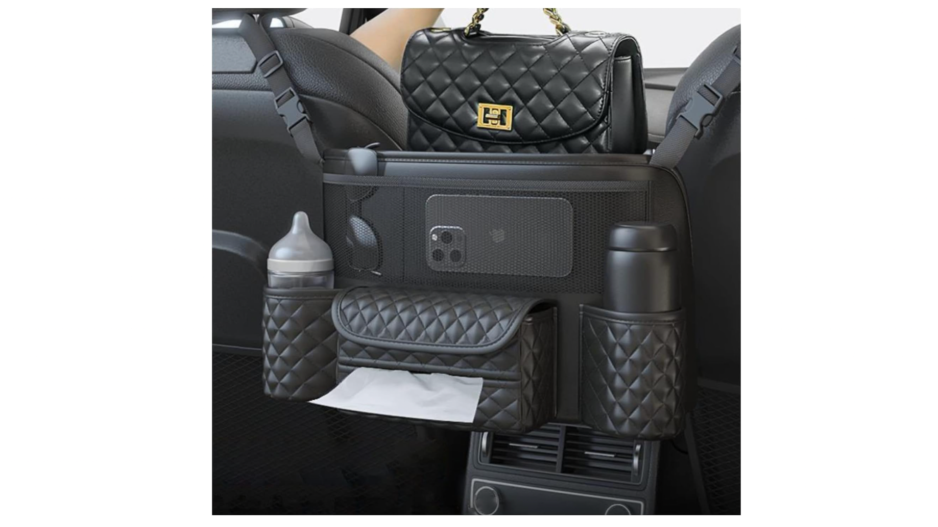 Sadly, I couldn't find an air compressor/flashlight/seatbelt cutter/window breaker/cup holder on Amazon, so please enjoy this quilted leather water bottle/cell phone/sunglasses holder that dispenses tissues and also holds your handbag.