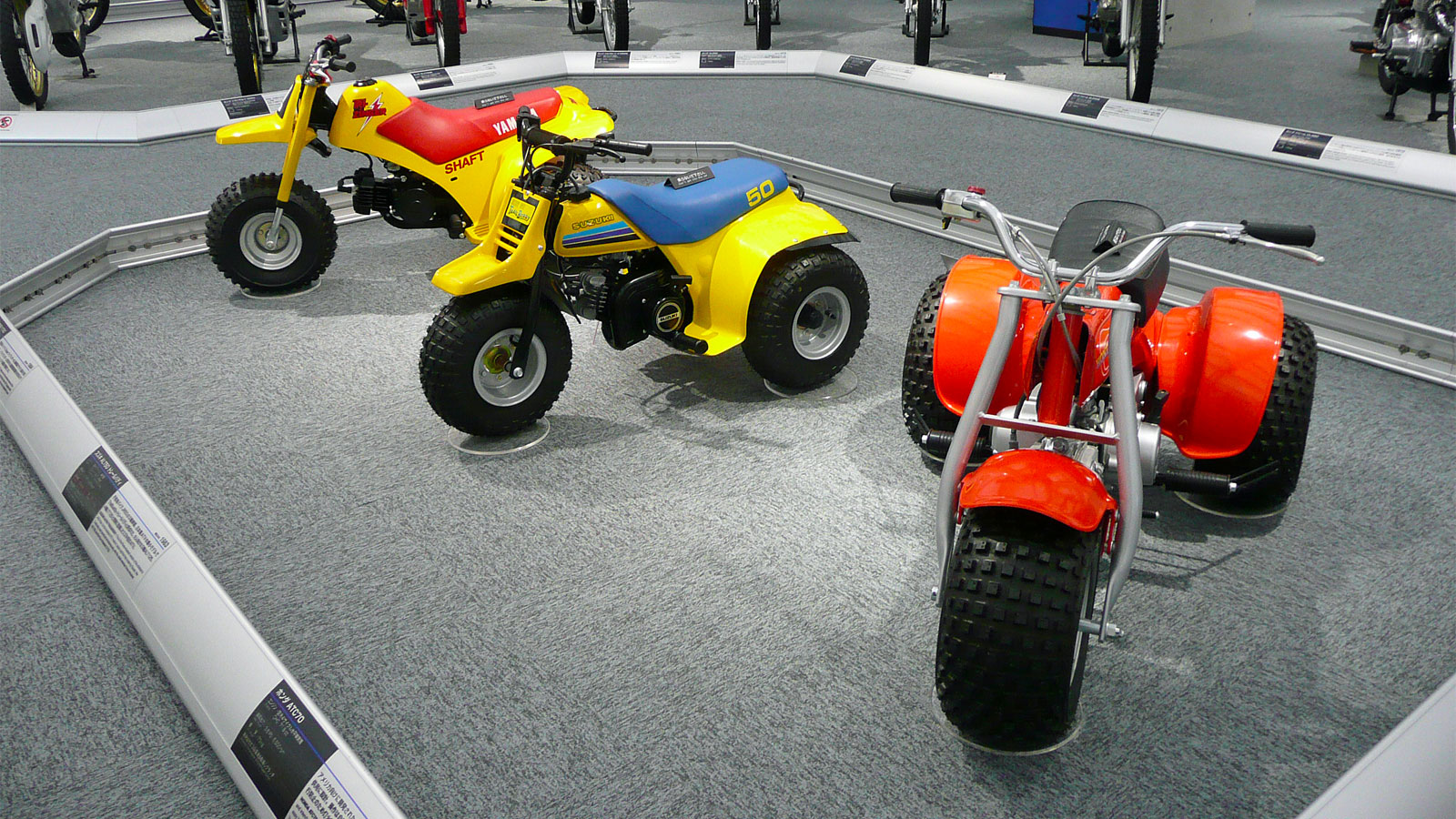 The Honda ATC was a range of small, three-wheeled off roaders that was produced until 1987. The orange one here (far right) is pictured alongside similar crafts from Yamaha and Suzuki.