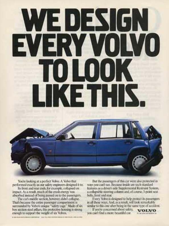 It was on the back of one of my auto show programs from when I was a kid, and always stuck with me – a lot of Volvo's advertising up through the 90's seems like it was inspired by the DDB VW ads from the 60's.