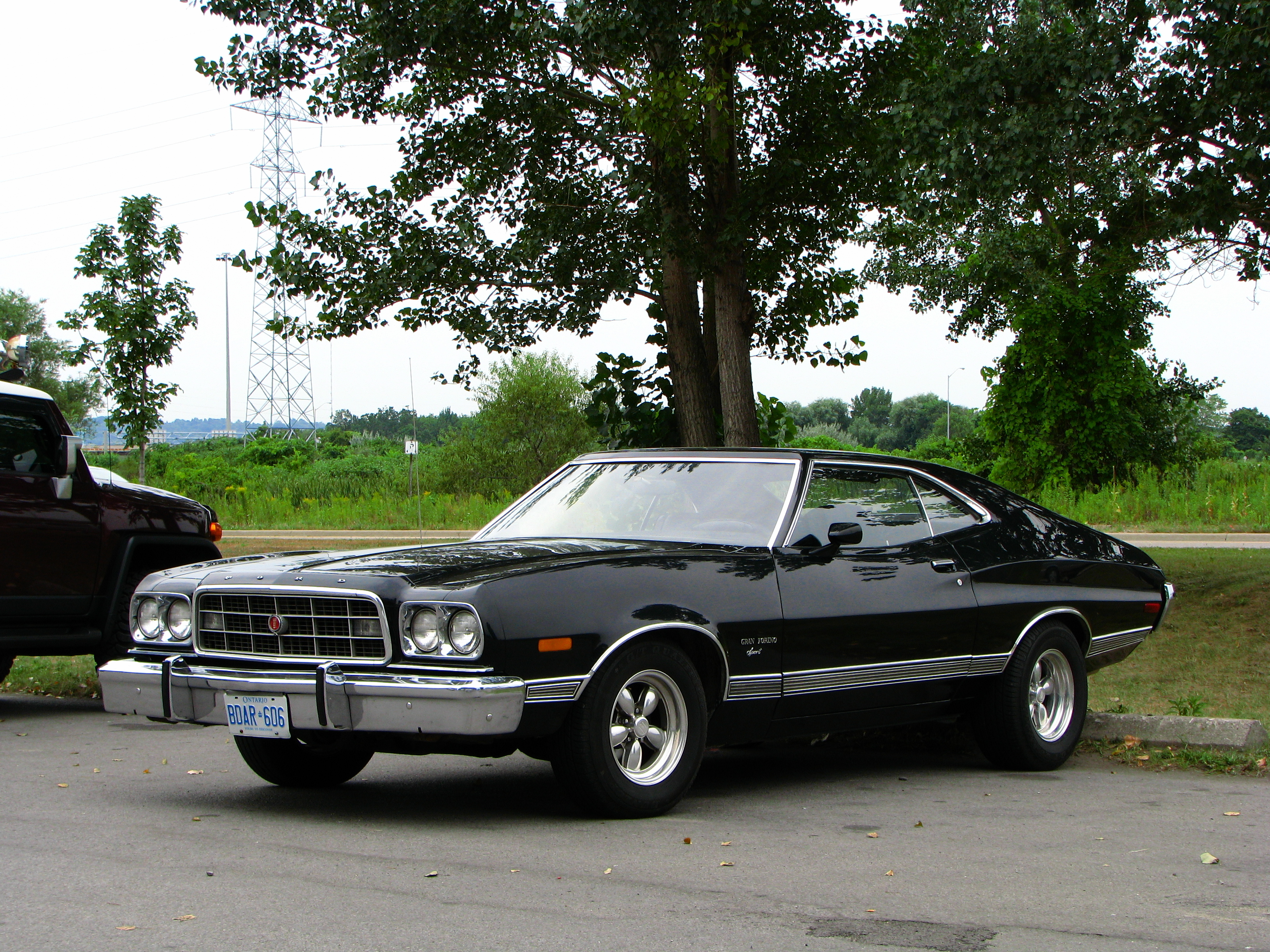 A Gran Torino that isn't wearing the Starsky and Hutch livery is a bit of an oddity. That white stripe on the red body somehow made the car feel smaller, more lithe and agile. Seeing one in all black is almost startling — the hood is how long? The headlights sit how far below the hoodline?