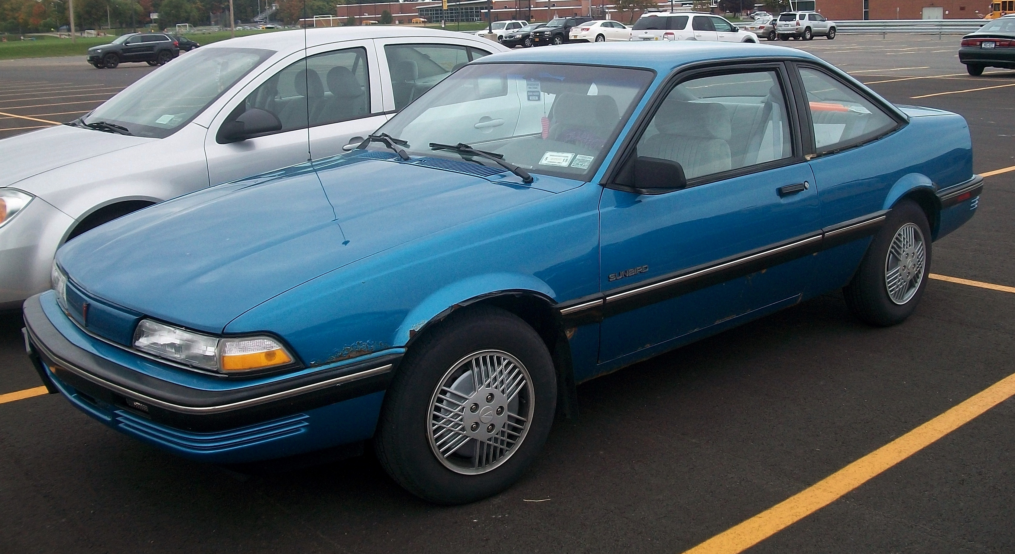 Our Driver's Ed car was an early-'90s Pontiac Sunbird. The three of us put together for our long freeway trip, in an early 1990s Pontiac Sunbird, were me, a 210-pounder, a member of our football team, and the 6'5" star of our basketball team. The discomfort, obviously, came from 3 large people stuffed into a tiny car.