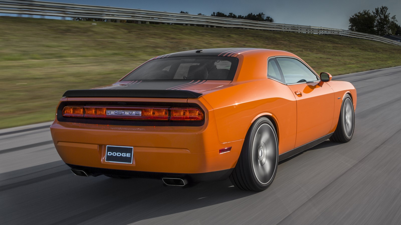 Anyway, I found a perfect example of Challenger to illustrate my point. What we've got here is a 2013 Challenger R/T with just 81,000 miles on the clock — finished in the correct orange color with a slightly aftermarket pistol grip shifter. It's perfect. Like a new Versa, this Challenger hasn't been in any accidents either. All you gotta do is take off those dumb vent things a previous owner put over the rear window, and you're good to go.