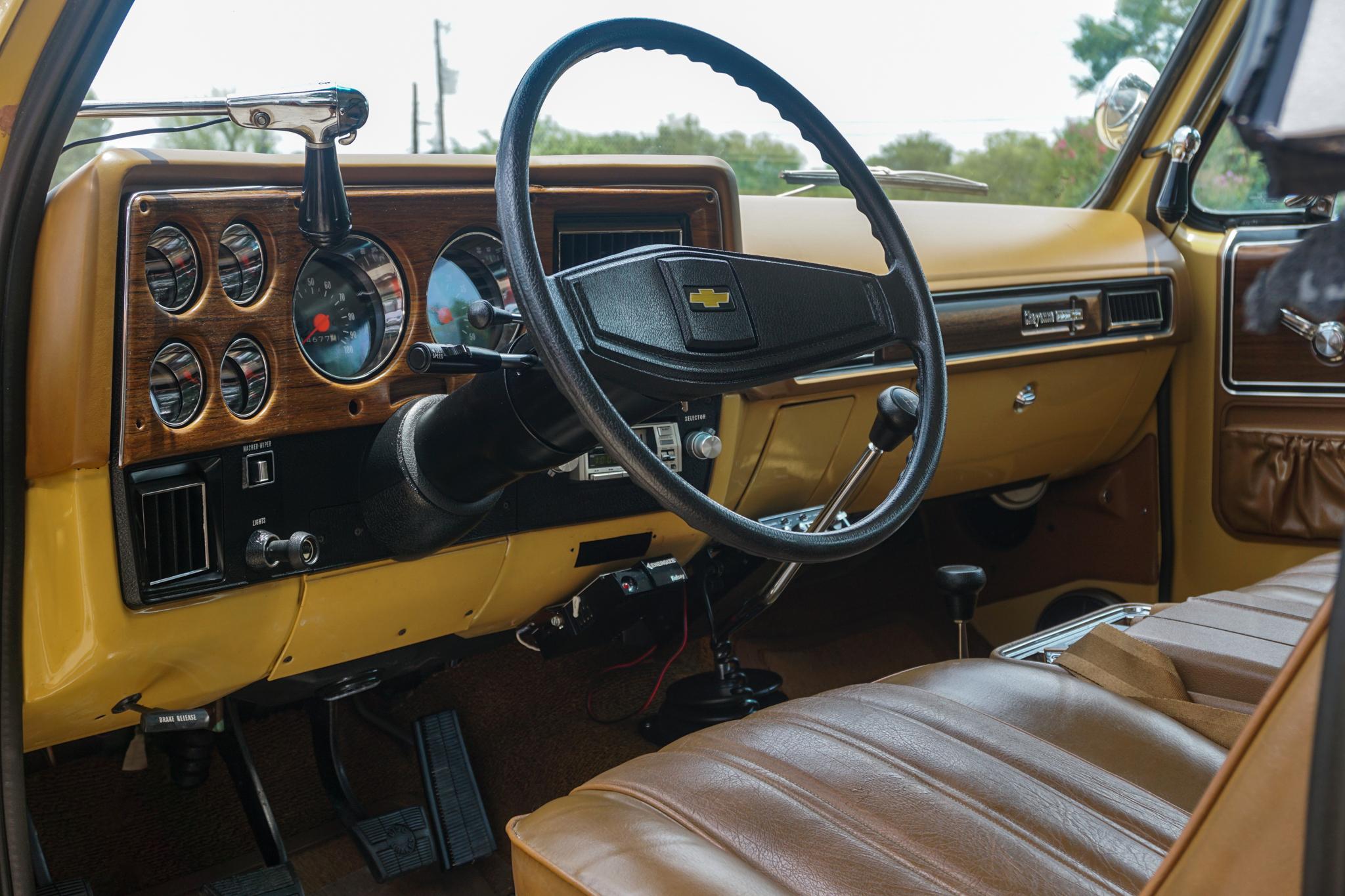 Of course, this one is a far cry from the smoky diesel sand-crawler I remember from when I was a kid, but it's no Avis-spec anonymous blob, either. Instead of the oil-burner, this one has a numbers-matching 350 small-block under the hood driving a five-speed manual transmission, standard A/C and padded roll-bar and removable roof. That's the kind of luxury you got with the Cheyenne package back then.