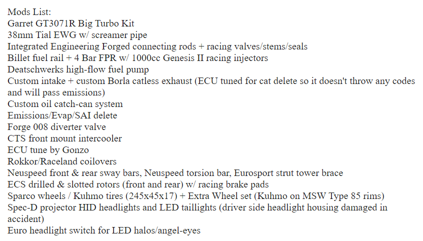 It's unclear if the crash occurred because so much power is getting sent through those poor wheels. The seller says that it runs and drives so good that the check engine light is off and there aren't any stored codes. The registration sticker on the license plate suggests that this car is legal until next summer, so the crash must have been recent.