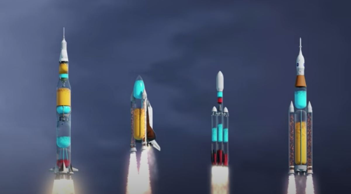 The four rockets are, from left to right, a Saturn V moon rocket, a Space Shuttle stack, a Space X Falcon Heavy rocket, and the upcoming NASA Space Launch System (SLS) launcher.