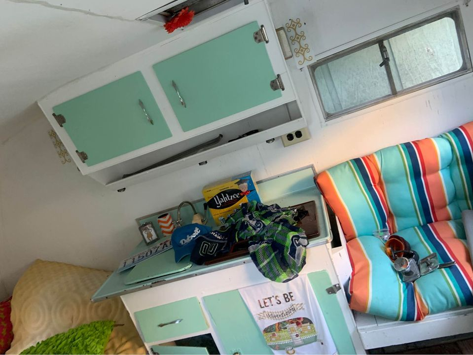 There is no shower and no toilet. You have more or less similar amenities as a pop-up camper, but with hard walls. One thing I love about this camper is that the color theming continues inside, too.