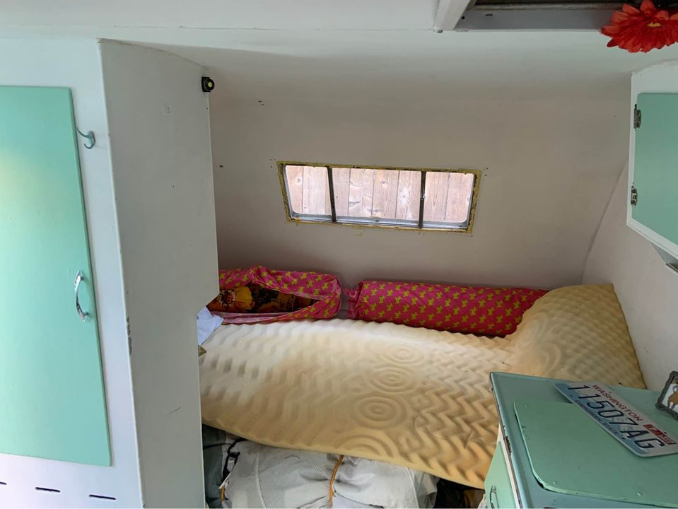 The layout of the camper is pretty simple. There's a table and seating up front, a small kitchen unit in the middle, a couple of cabinets and a bed.
