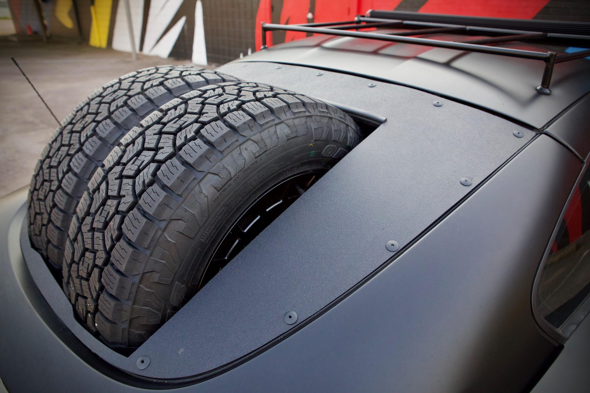 If you were wondering how the inside stays dry considering the hatch is cut open, the well the spare tires fit in has a seal.