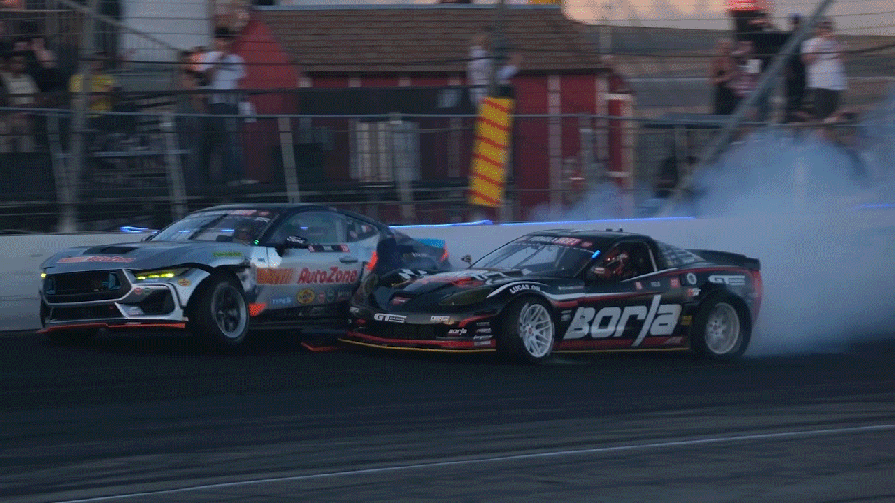 During a qualifying session on Saturday, Deane (a three-time FD champ) was up against Matt Field and his Corvette, attempting to make the finals at the 2023 season finale. Entering a left-hand slide on the Irwindale banking, the Corvette went wide, locking up and careening into the Mustang's passenger side (Deane's RTR Mustang is right-hand drive) and sent it skyward. Wheel-on-wheel contact popped the Mustang straight up and onto the top of the outside retaining wall.