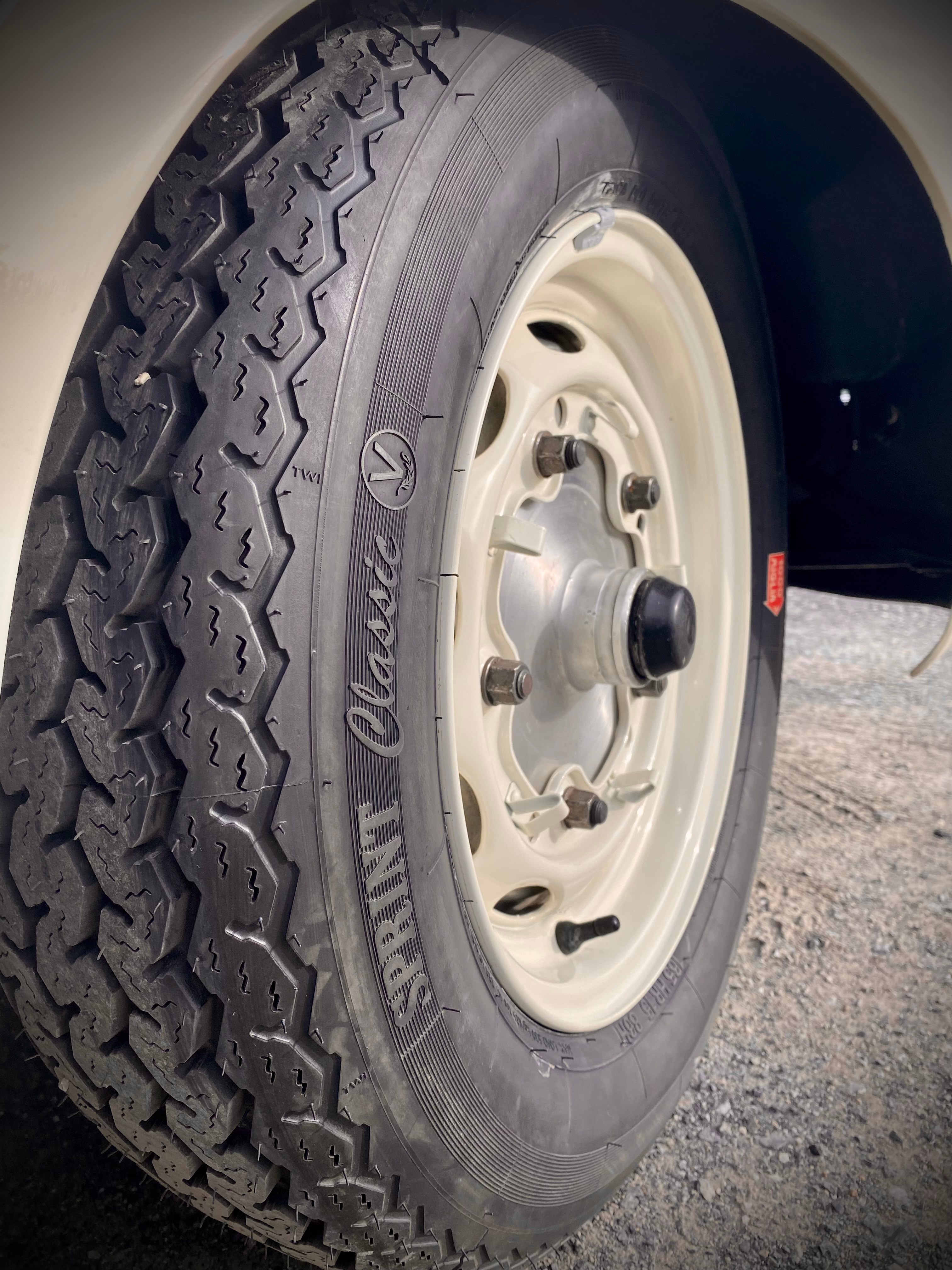 Tire maker Vredestein is a sponsor of this year's 1000 Miglia, as well as this car, so naturally it's riding on Vredestein Sprint Classic tires. These are actually pretty nifty tires — Vredestein makes them in vintage tall-and-skinny sizes with historically accurate sidewall design and tread patterns, but they're constructed using modern tire engineering and rubber compounds. The result is a thoroughly modern tire that grips, turns and stops way better than any original rubber ever could, but perfectly fits the aesthetic of a painstakingly restored classic car. Vredestein even makes vintage-style snow tires if you really wanna get wild with your vintage machine.