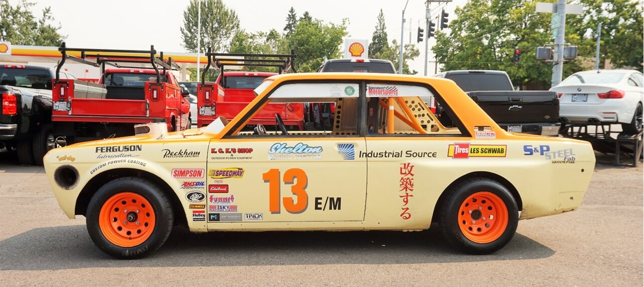 What we have here is a 1969 Datsun five and dime two-door sedan, which was already a pretty popular chassis for vintage racing and the like, because it was raced in-period, it's relatively lightweight, and it's so incredibly simple. The 510 was one of the first truly successful Japanese imports in American motorsport, and it helped build the legacy of the Nissan brand that exists today.