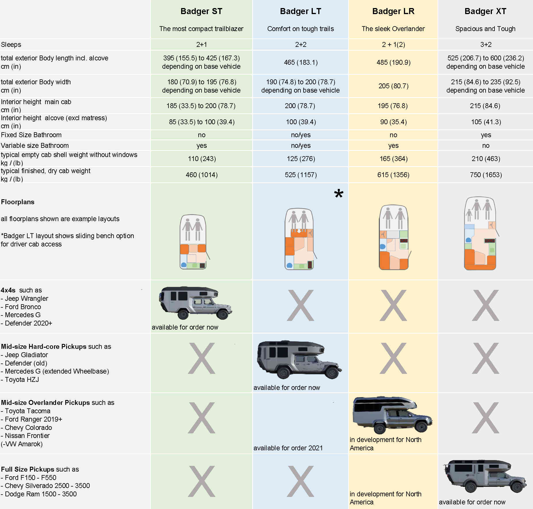 The smallest Badger ST comes in at around 1,014 pounds, while the largest Badger XT comes in at 1,653 pounds before customization. Those numbers are impressive, as a typical American truck bed camper can easily be 1,000 pounds heavier than even the Badger XT.