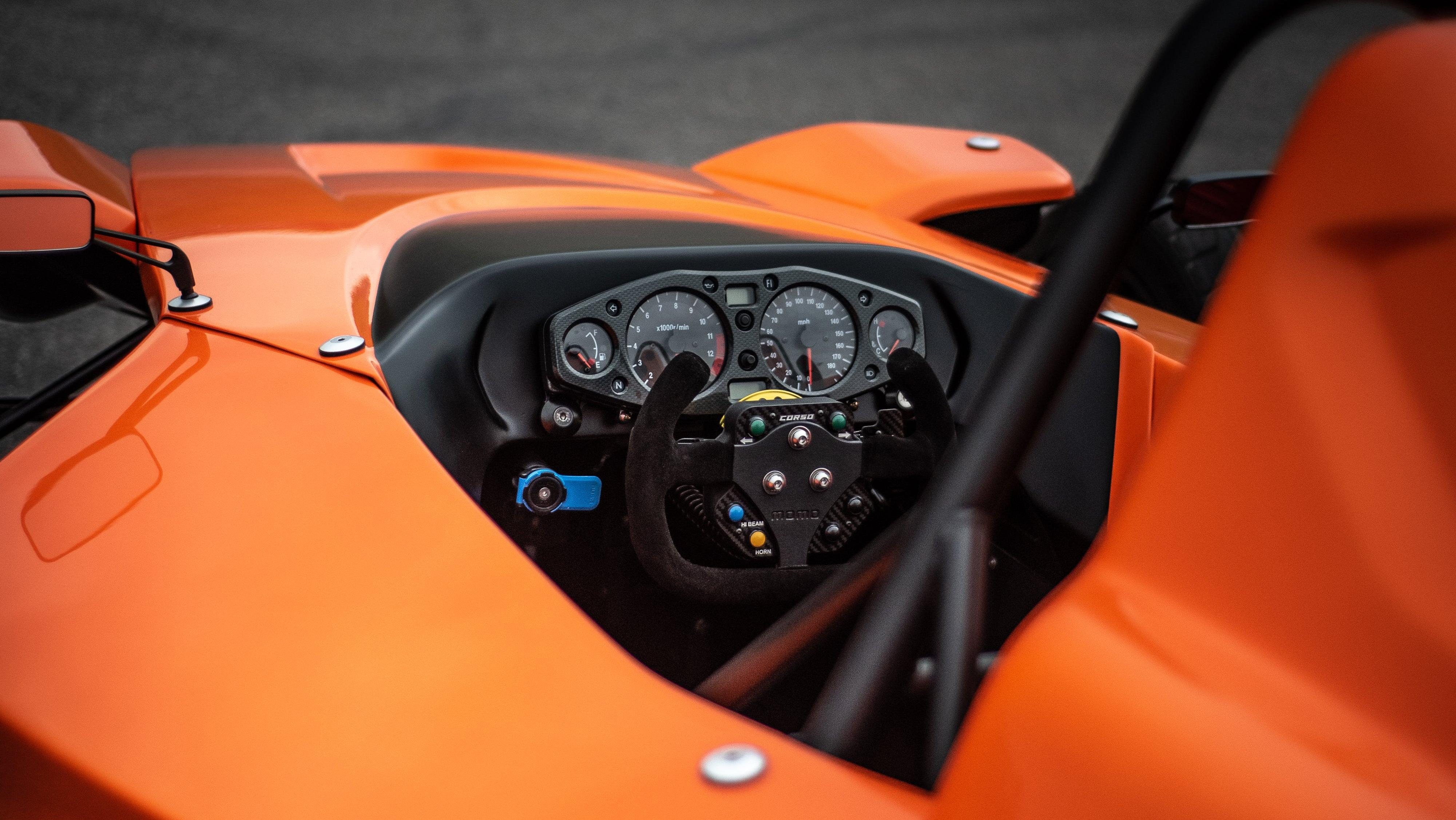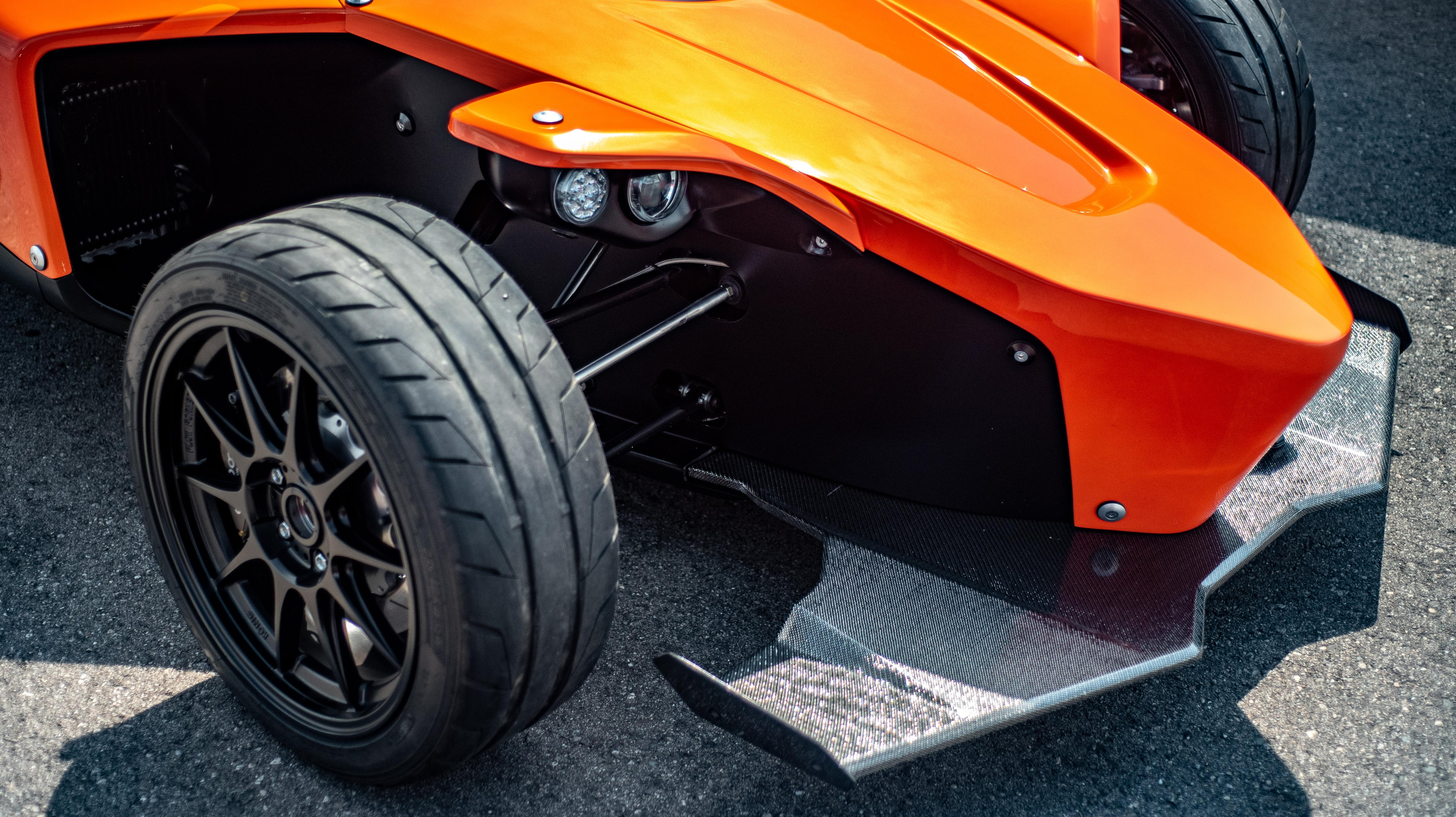 The chassis — unbelievably at this weight — is constructed of steel tube with a composite carbon body laid over the top of it. The front suspension is a motorsport-inspired pushrod setup with double-adjustable shocks from the factory. You get billet uprights, Wilwood brakes, adjustable pedals, the works! Out back you get a custom single-sided swingarm and a giant meaty rear tire. The company hasn't released exact specs of the wheels and tires, but based on the video above, they appear to be plenty grippy. Delivering over 1.4 g through a corner is mighty impressive. And it still manages to find slip angle with on-throttle corner exit. That's my kind of ride!