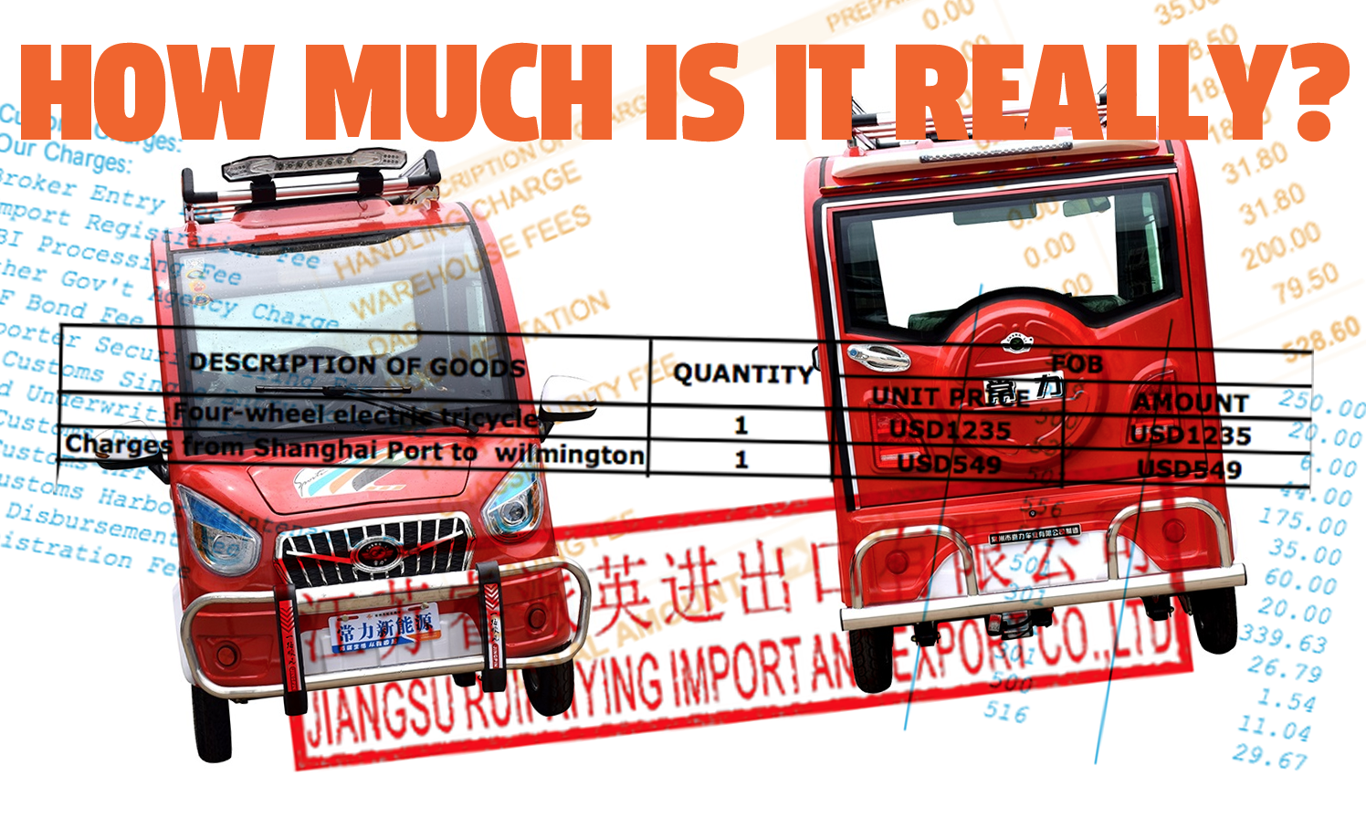 A lot of that money goes to the government for import duties and other U.S. Customs fees, and that import duty is based on the value of what you're bringing in—so, if you want to import a more expensive weird-little Chinese EV, you'll end up paying more than the $339.63 we had to pay.