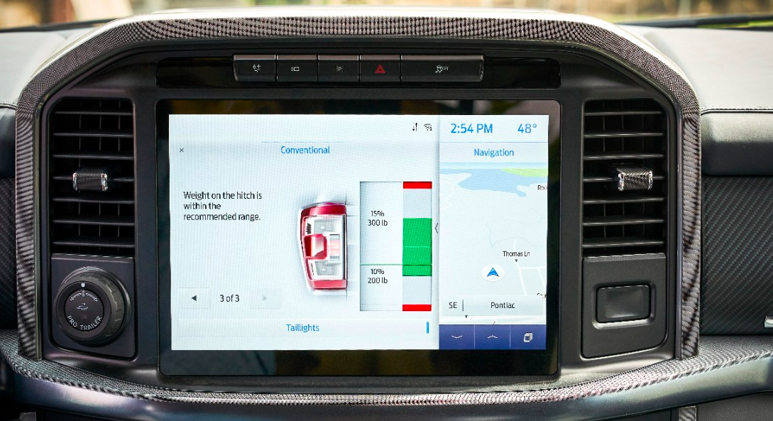 As for the Smart Hitch function, that shows a horizontal bar relative to a green bar that floats between two small red bars (see below). The bottom red bar represents a condition where the tongue weight is too low (below 10 percent of trailer weight, which the user inputs into the system manually), and the top bar representing a tongue weight that's too high (above 15 percent of trailer weight).