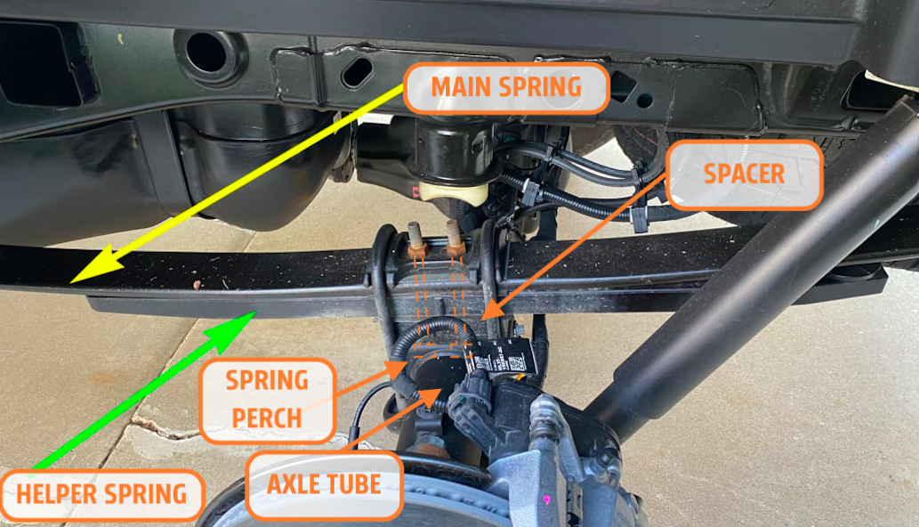 This is a little beyond the scope of this article, but I want you to know exactly where this ride height sensor is mounted, so take a look at this image of the rear suspension without the ride height sensor, courtesy of one of Dan Edmunds' always-excellent suspension deep-dives. Though I haven't looked at the leaf pack closely, it's safe to say the two bolts where the sensor mounts are the center pins that locate the spring to the axle by passing through the main leaf, through the helper spring, through the spacer, and poking down into two holes in the spring perch welded to the axle tube (I've added some arrows to Dan's image):