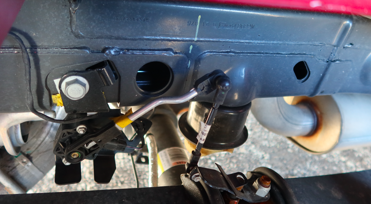 Notice how long the rear sensor's lever arm is (two images above); I'm assuming this has to do with the tremendous suspension travel of that rear suspension, particularly at the point of measurement there at the center of the leaf pack. I'm also assuming this accounts for a leaf spring's motion in the X-direction (the center of a leaf spring doesn't just travel perfectly up and down, it also moves longitudinally).