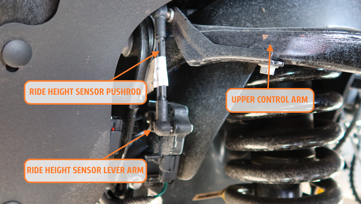Ride height sensors are funny looking things. One end of a skinny pushrod hooks to a bracket hard-mounted to the vehicle's chassis, while the other end attaches to a lever arm that's part of a rotary sensor (I'll guess it's a potentiometer, of sorts) mounted to a suspension component that moves anytime the wheel travels up and down.