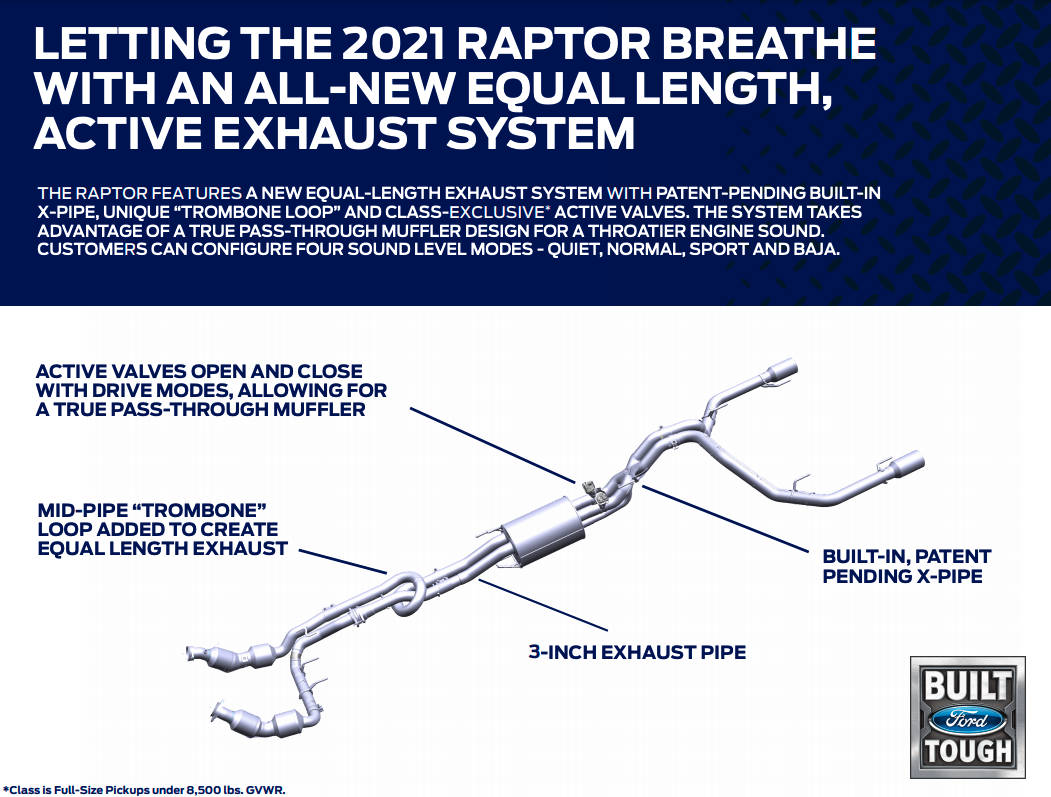 A new three-inch equal-length exhaust system features a patent-pending built-in X-pipe, unique "trombone loop" and first-for-Raptor active valves. The system takes advantage of a true pass-through muffler design that improves sound quality. Customers can configure four sound level modes – Quiet, Normal, Sport and Baja.