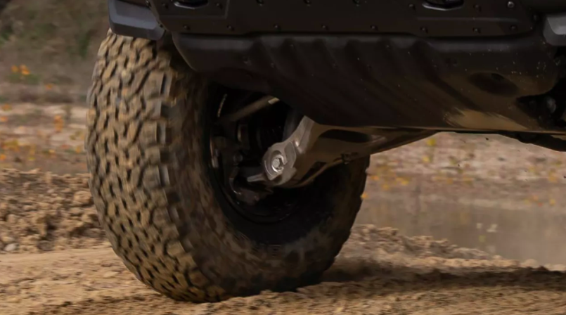 The Ford Bronco Raptor will be equipped with Fox's Live Wire twin-tube bypass dampers (also used on the F-150 Raptor), making it ride much higher than the standard SUV. It'll be available with 37-inch BFGoodrich K02 all-terrain tires (also a newly available option on the F-150 Raptor), though a set of smaller 35-inch tires should be standard.