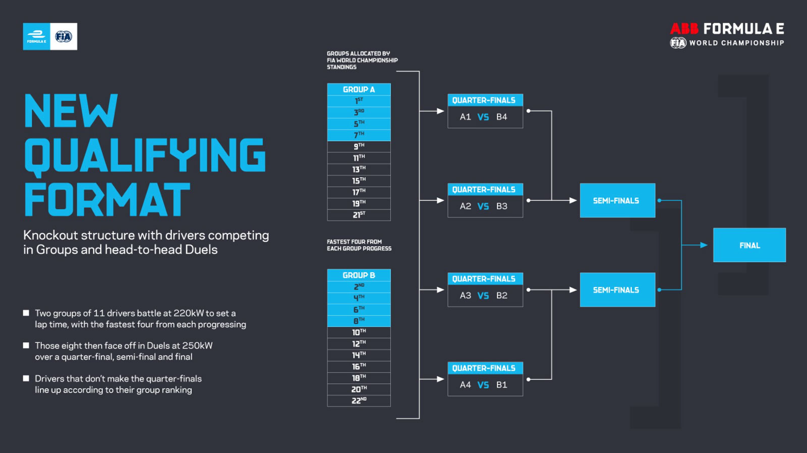 For 2022, Formula E will run a new knockout qualifying format to set the grid for each race. Under the new rules, drivers will be divided between two groups of 11 based on their position in the Drivers' World Championship. Each group will have a 10-minute session in which drivers must set their fastest lap.