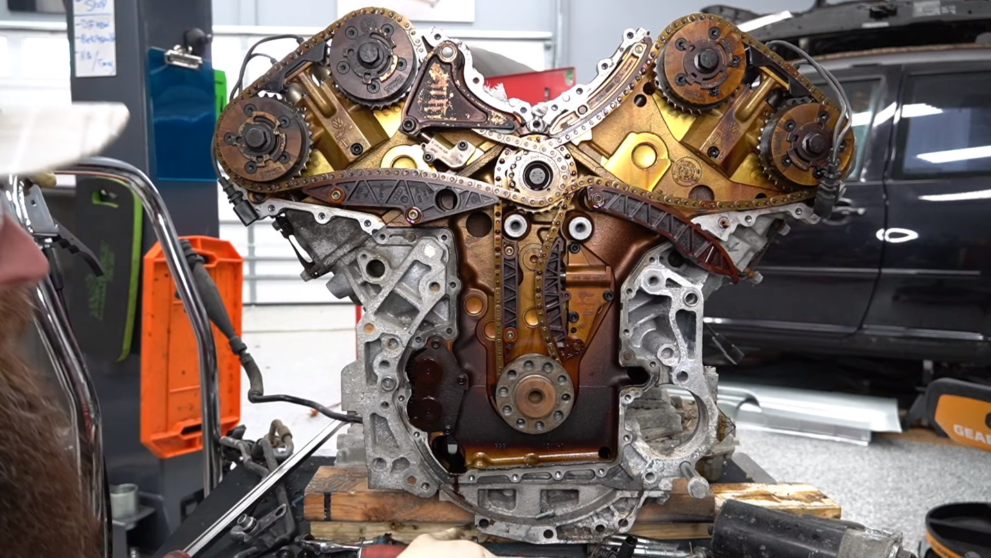 He continues on, making his way to the timing chains by removing all of the accessories from the engine. It's here that he spots another scary detail about the engine's condition.