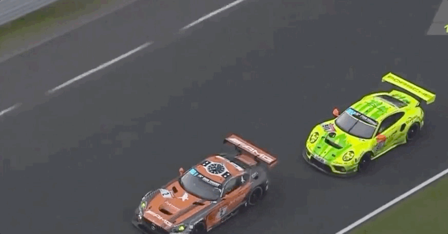 A little over five hours into the full-day-long event, Porsche pilot Kévin Estre zoomed up on Dirk Müller's Mercedes in the lead, slipstreaming off the Benz's giant wing, and then squeaking past by taking half his car onto the grass to take the race lead.