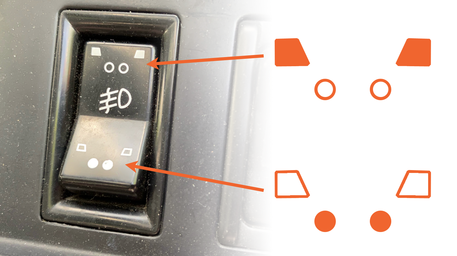 At first, they may seem as incomprehensible as the normal icon, but after a moment you recognize what's going on there: the upper trapezoids are the normal headlamp shapes, and the two circles are the foglamps.