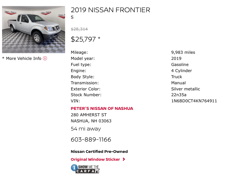 "I'm currently shopping for a CPO or lightly used two to three year old Nissan Frontier in old man, 2WD, nothing spec. What I have found is absolutely criminal. Using Nissan's CPO search tool, I found a 2019 S King Cab 2WD 5MT with less than 10k miles on it, priced over 5k more than MSRP when it was brand new. It's within 10% of buying a 2022 D41 base model King Cab. I called the dealer, and of course the sales manager is not available (probably eating a large sub sandwich). I wanted to find out why a $15k truck is now $25k for no apparent reason other than "the used truck market is crazy right now" answer that I got from the pleasant junior sales girl. Please find the attached pics for reference."