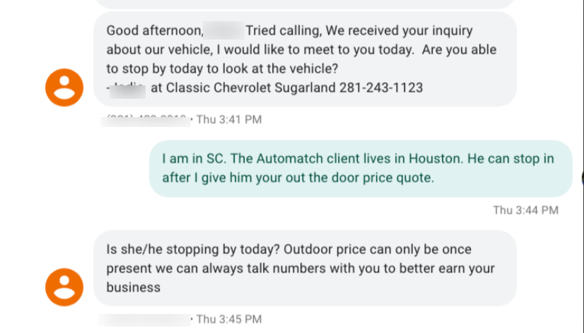 Below is a text message exchange one of my agents had with an internet sales rep of Classic Chevrolet.