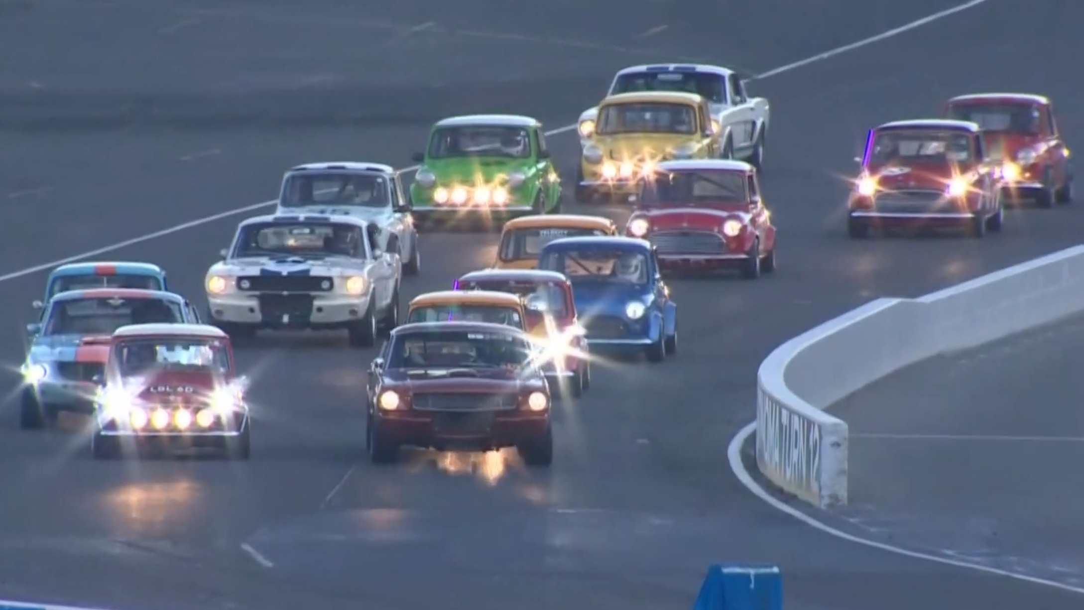 A few years ago, the Northern California vintage racing festival Velocity Invitational introduced a new class called Mini vs. Mustang. In addition to the tantalizing spectacle of big American V8s taking on the tiny British bulldogs, the series runs this race as the last event of the day, taking the racing into the darkness hours, for a blazing halogen electric light show to go along with it. It's the age old David Vs. Goliath debate, and the competitors always put up a good fight. I got to watch this throw down at Laguna Seca a couple of years ago, but for 2023 the event moved to Sonoma Raceway. Here's what that looks like.