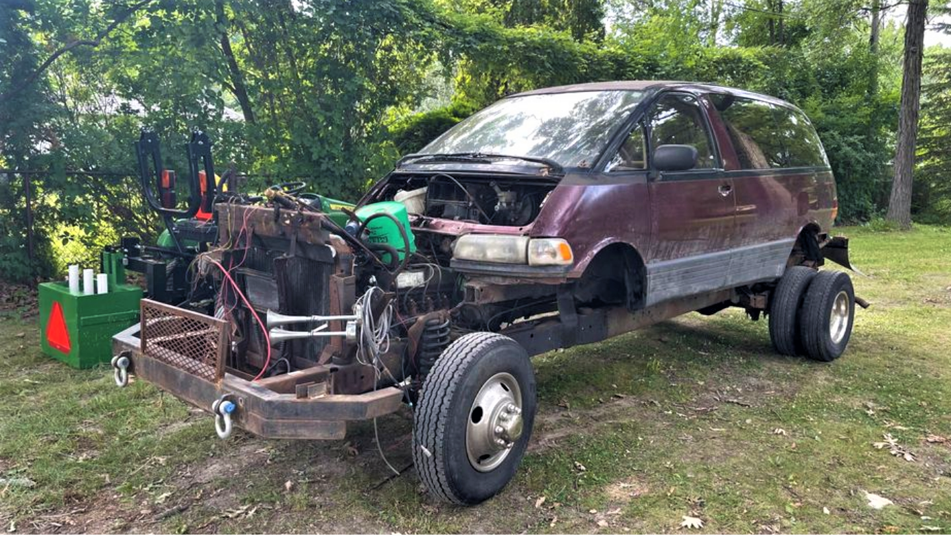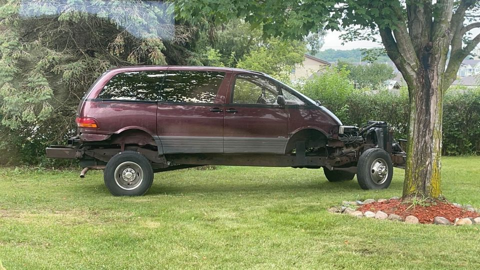 This Previa is even weirder than when it left the factory. It now rides on the RV's backbone, which is a little hilarious because that frame was made for much heavier work than carrying around a minivan body.