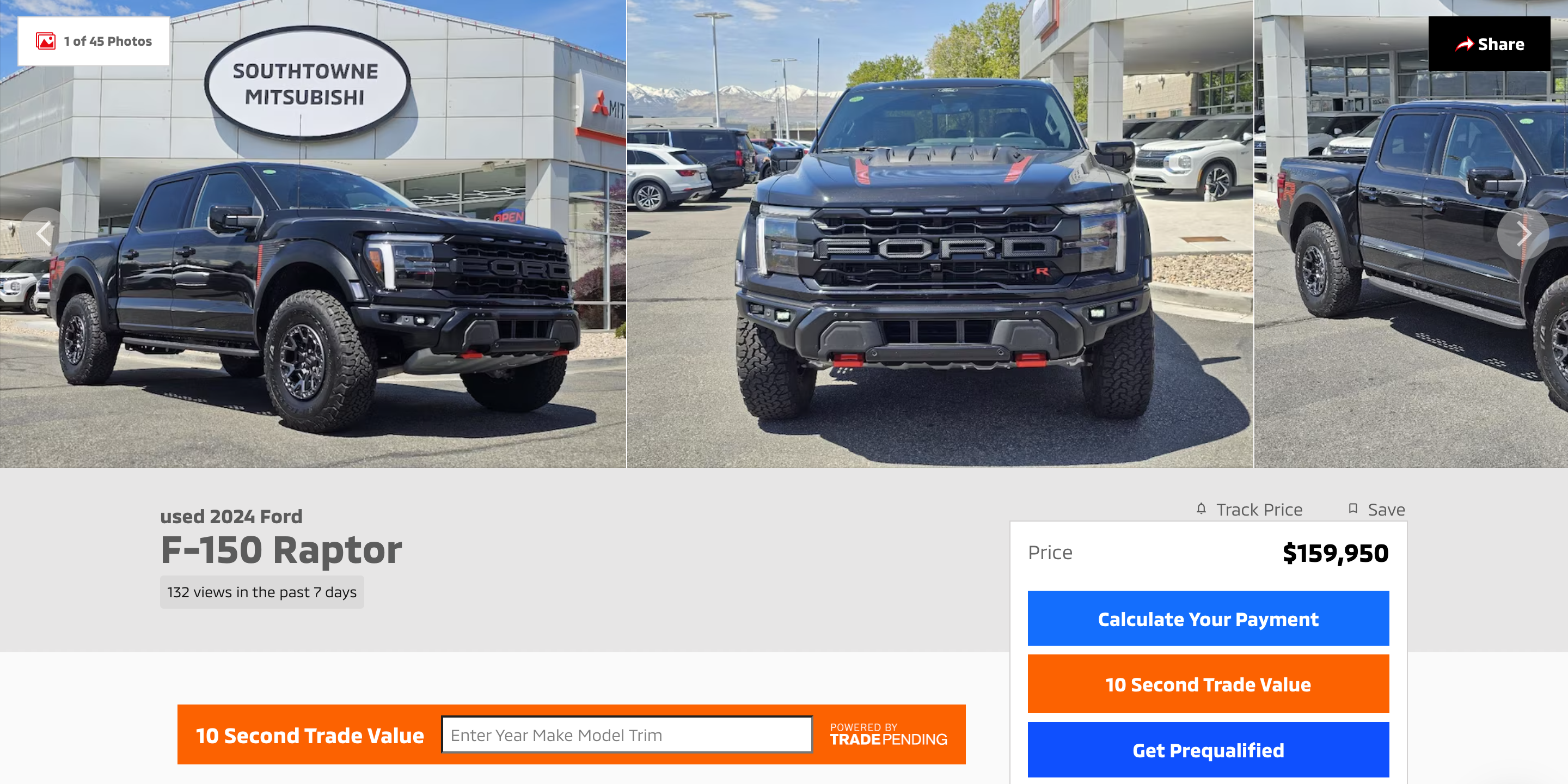 Because of this light lineup, Mitsubishi dealers always seem to have great used inventories filled with things you wouldn't expect to see on a Mitsubishi lot. Take Southtowne Mitsubishi in Sandy, Utah, for instance. The dealer currently has 68 new Mitsubishis for sale, nearly all of which are Outlanders. Their used inventory is massive however, enough for two or three dealers' worth of cars. They currently have 950 used cars for sale, more than a dozen times the number of new Mitsubishis. And there's some interesting shit in the lot, showing that these guys probably live at local auctions. They have 58 F-150s for sale, 13 of which are Raptors, and one is a 2024 Raptor with just 206 miles that they're asking $159,950 for.